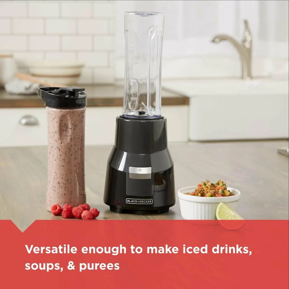 Create personalized blended drinks with the BLACK+DECKER™ FusionBlade™ Personal Blender. Perfect for single servings, the blender comes with a pair of 20oz jars with twist-on travel lids to keep your beverages in place no matter where you go. The powerful stainless steel FusionBlade makes customized beverages for any occasion. It’s designed to crush ice and blend foods and liquids evenly so you can mix some drinks for a night in or create a protein shake to take to the gym.