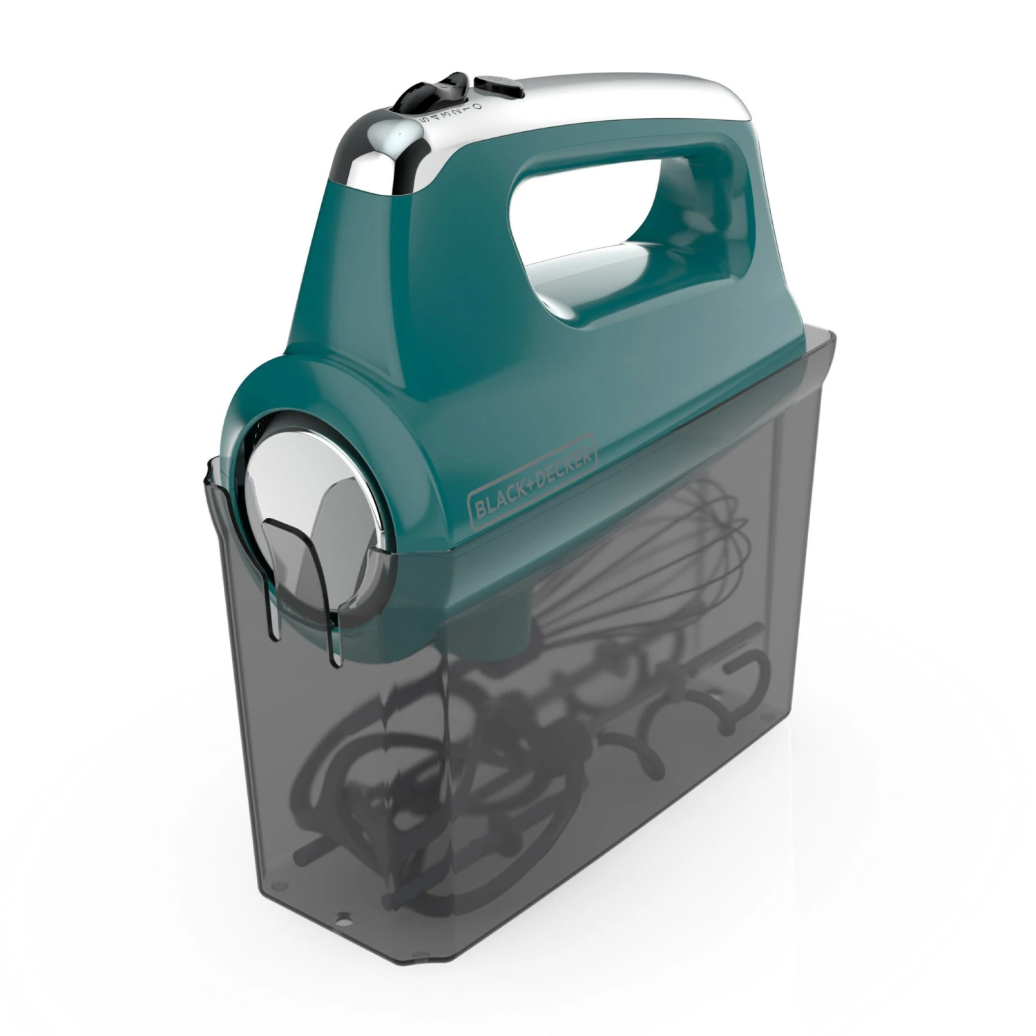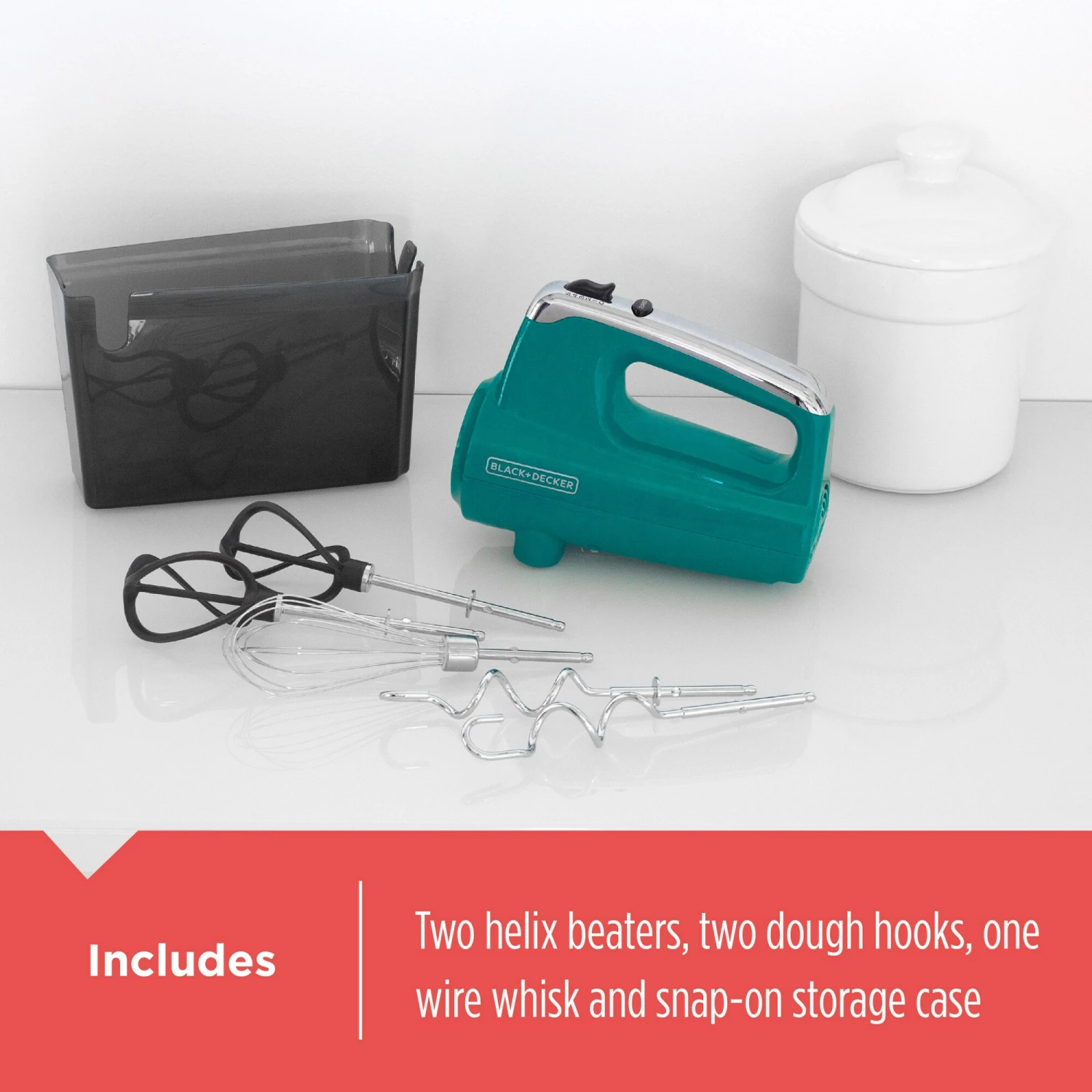 - Snap-On Storage Case: The storage case holds all included accessories and uses the mixer as the snap-on cover