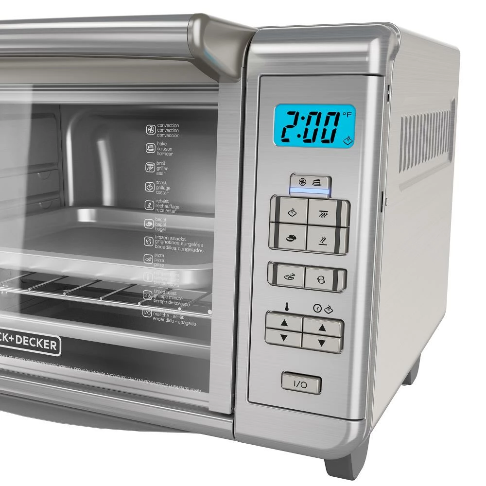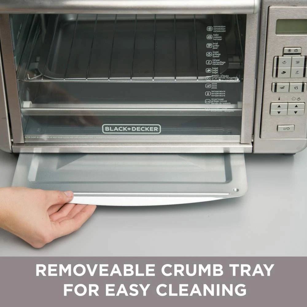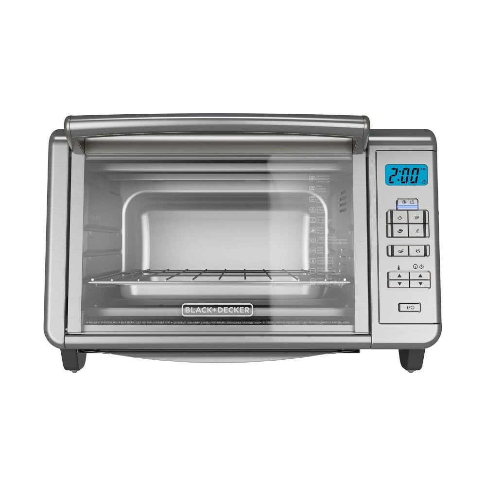 At-home cooking just got easier with the BLACK+DECKER 6-Slice Stainless Steel Digital Convection Countertop Toaster Oven with Broiler Pan. With a large interior and 20% faster cooking times than previous models, the seven dedicated cooking functions quickly perfect everything from 12-In pizzas to reheated leftovers. Intuitive digital controls make it easy to set the time, temperature, and cooking function, and the 120-minute timer features stay-on and auto-shutoff functionality. Convection technology circulates air within the oven for fast and even results while baking. Plus, the toaster oven includes a broiler pan and an external crumb tray that slides in and out, making cleanup a breeze. When it’s time to eat, trust the #1 brand in toaster ovens—BLACK+DECKER. Compared to BLACK + DECKER TO1660B. Three rack positions bake an entire chicken or finish steaks right under the broiler! The included rack slides in to three different positions for flexible cooking. Bake/broiler pan don’t worry about finding pans to fit in the oven. The included baking/broiling pan fits perfectly, making it easy to insert and remove food. Toasting rack also included.