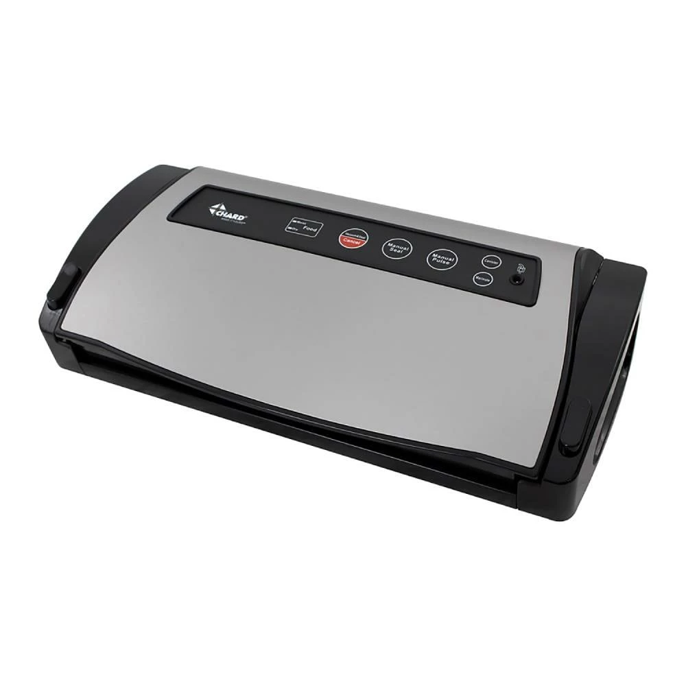 The CHARD Premium Vacuum Sealer puts you in charge when it comes to preserving your favorite foods. Multiple push button functions give you the choice to preserve your harvest exactly the way you like, which is great when vacuum sealing a wide variety of food items. The Dry/Moist function allows you to choose between different food types and Pulse Mode lets you control the pressure when it comes to sealing delicate food items. The Hose Port allows for the use of additional accessories which can be used with the Marinate or Canister settings. The upper heating element is Teflon-coated to help eliminate overheating which ensures consistent break-proof airtight seals. The lower sealing strip and gaskets are removable for quick and easy clean up. You will always have a bag within reach with the convenient roll storage compartment and the built-in bag cutter enables you to create specific sized bags. The color and stainless steel finish is a classic combination which will accent any kitchen counter perfectly and the compact design gives you the room needed to prepare and preserve your best-loved meals. The CHARD Premium Vacuum Sealer also includes samples of both 8-in and 11-in CHARD Vacuum Sealer Rolls.