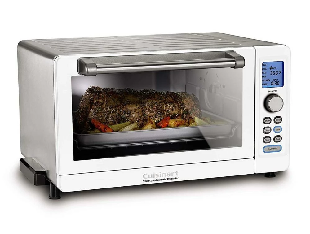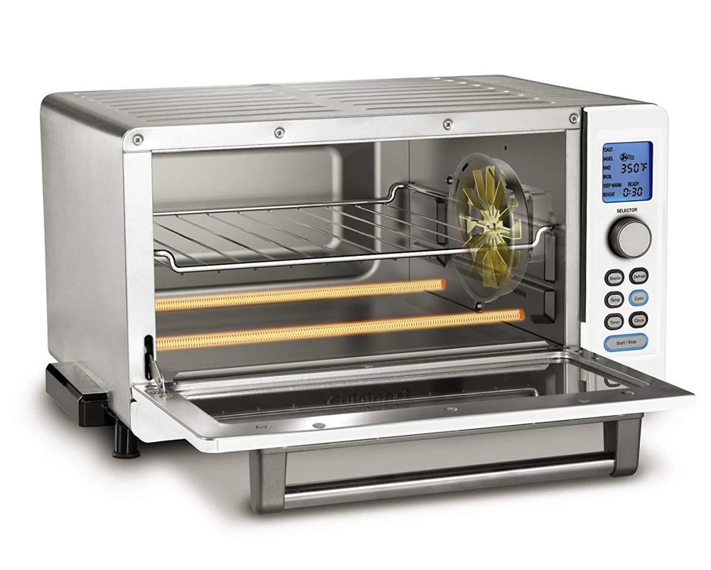 The Cuisinart TOB-135 Deluxe Convection Toaster Oven Broiler is designed with 9 functions, including convection for making delicious cakes, potatoes and roasts. Sized to accommodate a whole chicken, a 12-inch pizza, or 6 slices of bread, the unit is controlled by an electronic dial and LED buttons. The large blue back-lit LCD allows for the quick and easy setting of function, temperature, and cook time. The Exact Heat sensor maintains precise oven temperatures, and the Always Even shade control ensures that toast consistently turns out the selected shade.