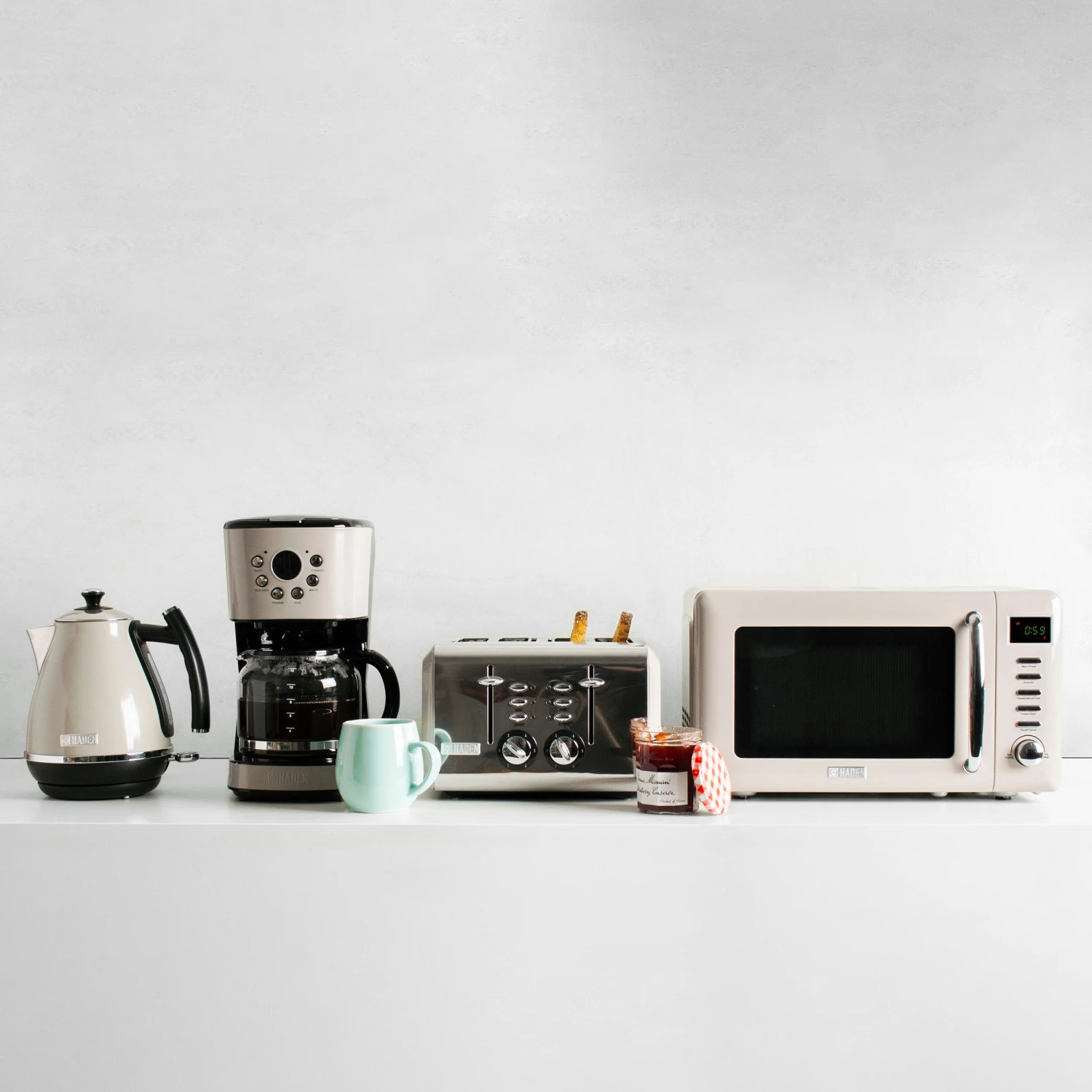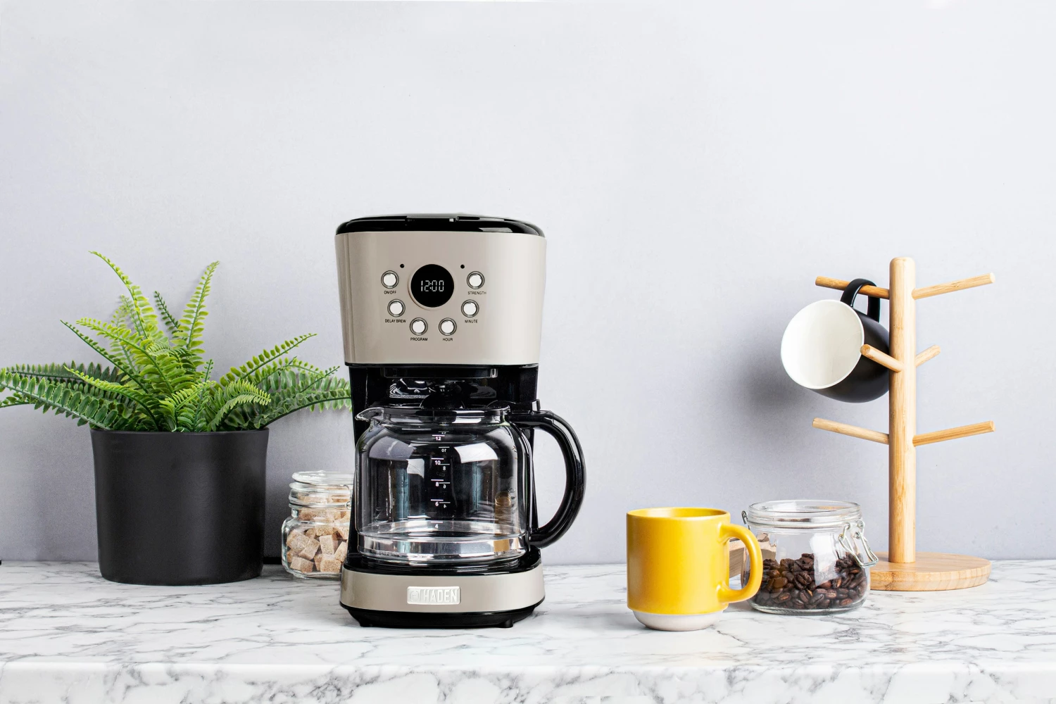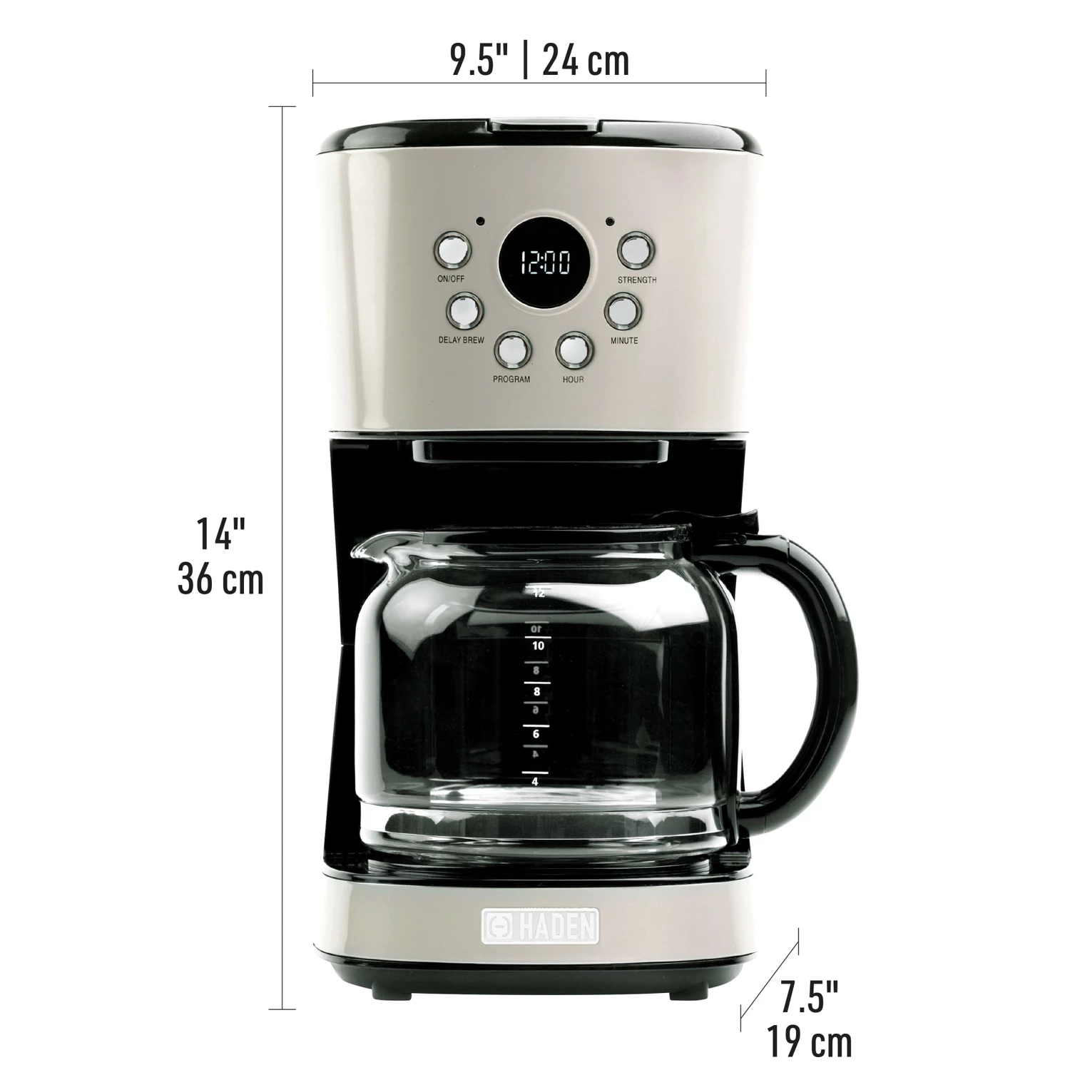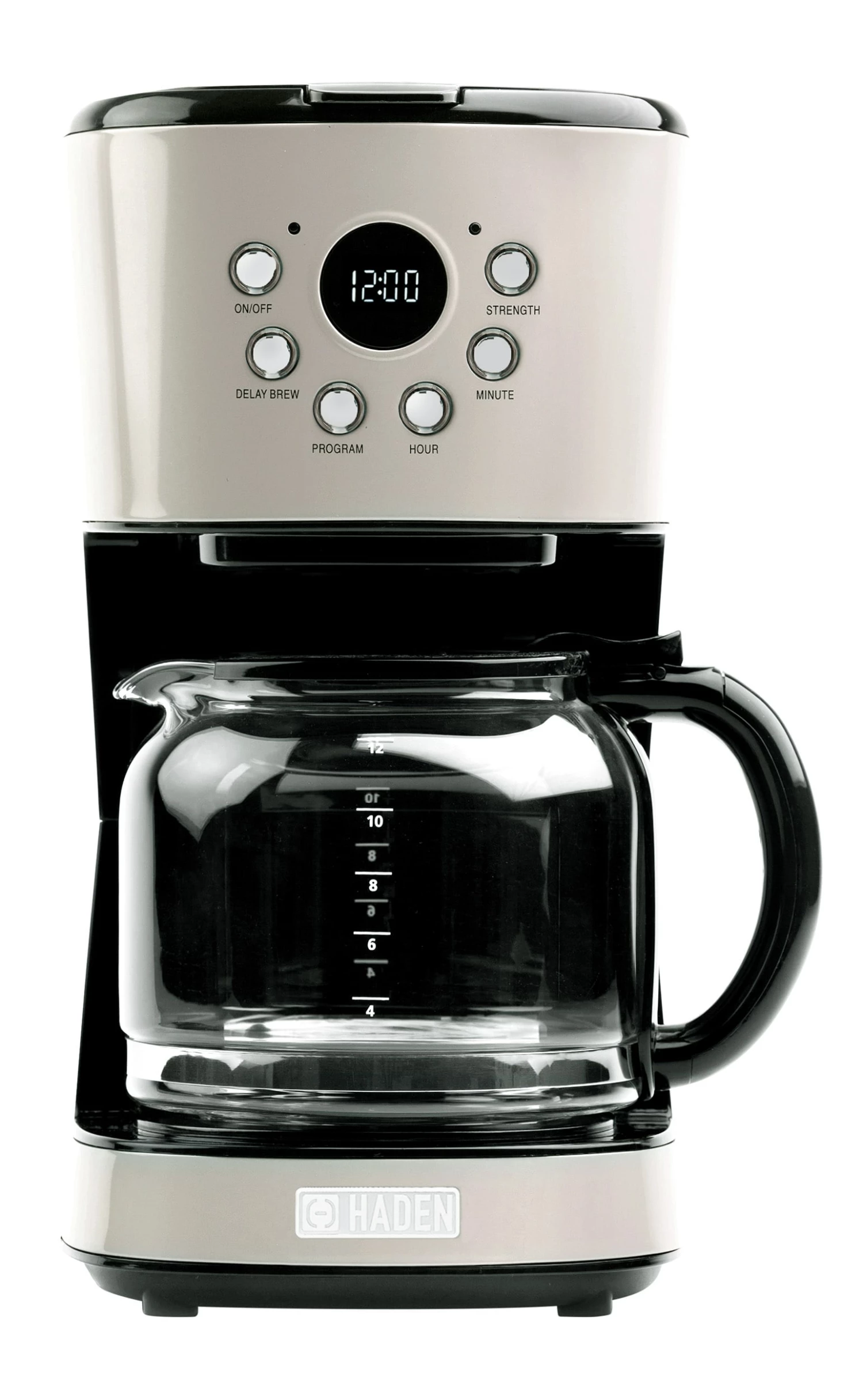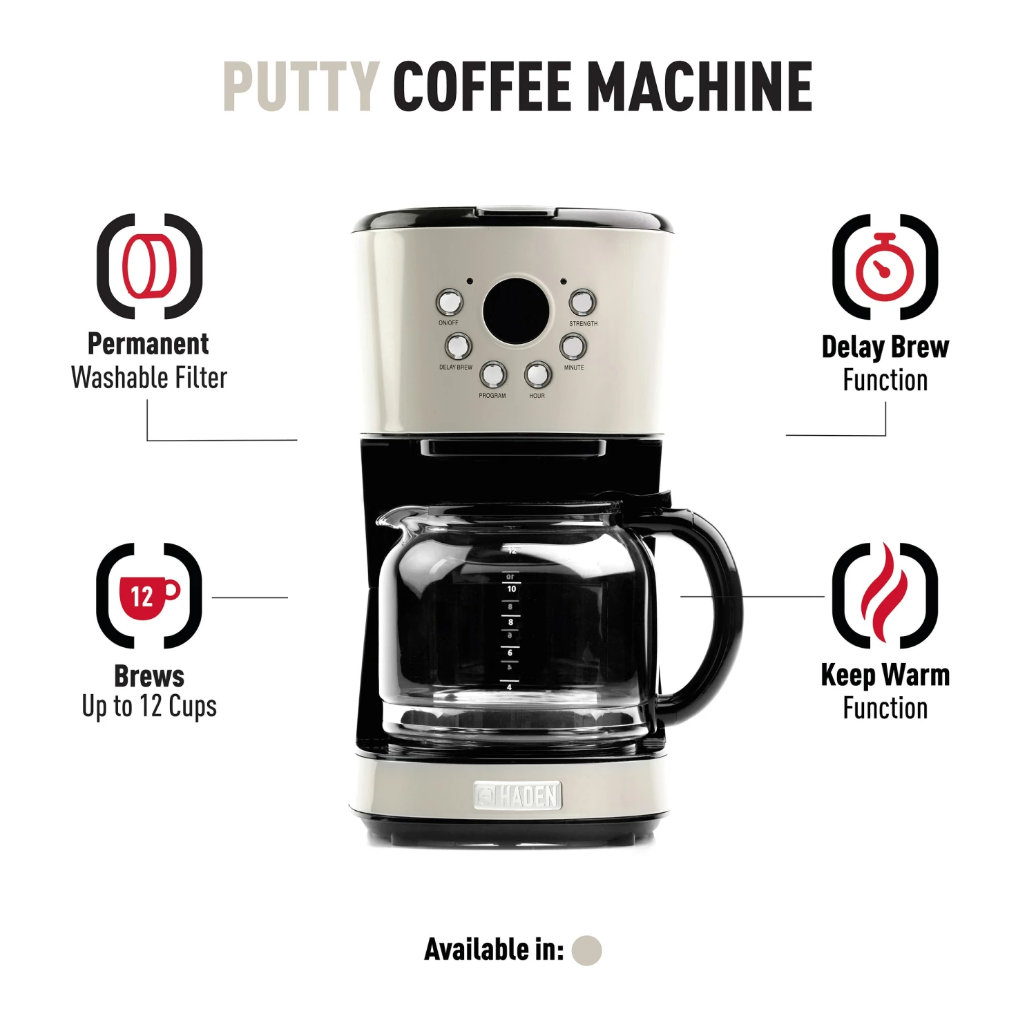 Produce the perfect cup of coffee with ease and style with the Haden filter coffee maker. The elegant putty color will add a touch of class to any kitchen. This coffee maker has six functions including on/off, delay brew, program, hour, minute, and strength. It also has an LCD display and a thirty-second anti-drip feature. The 1.5 liter/12 cup glass carafe and funnel are also dishwasher safe for added convenience. This coffee maker also has a keep warm feature, so if one cup is not enough you can simply pop back and pour yourself another cup! Perfectly matches our Dorset putty and Cotswold putty collections.