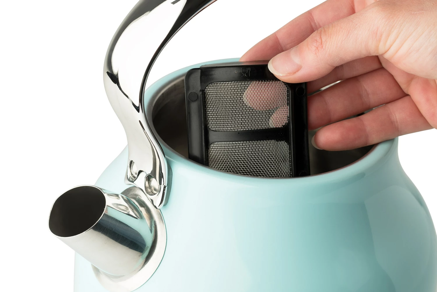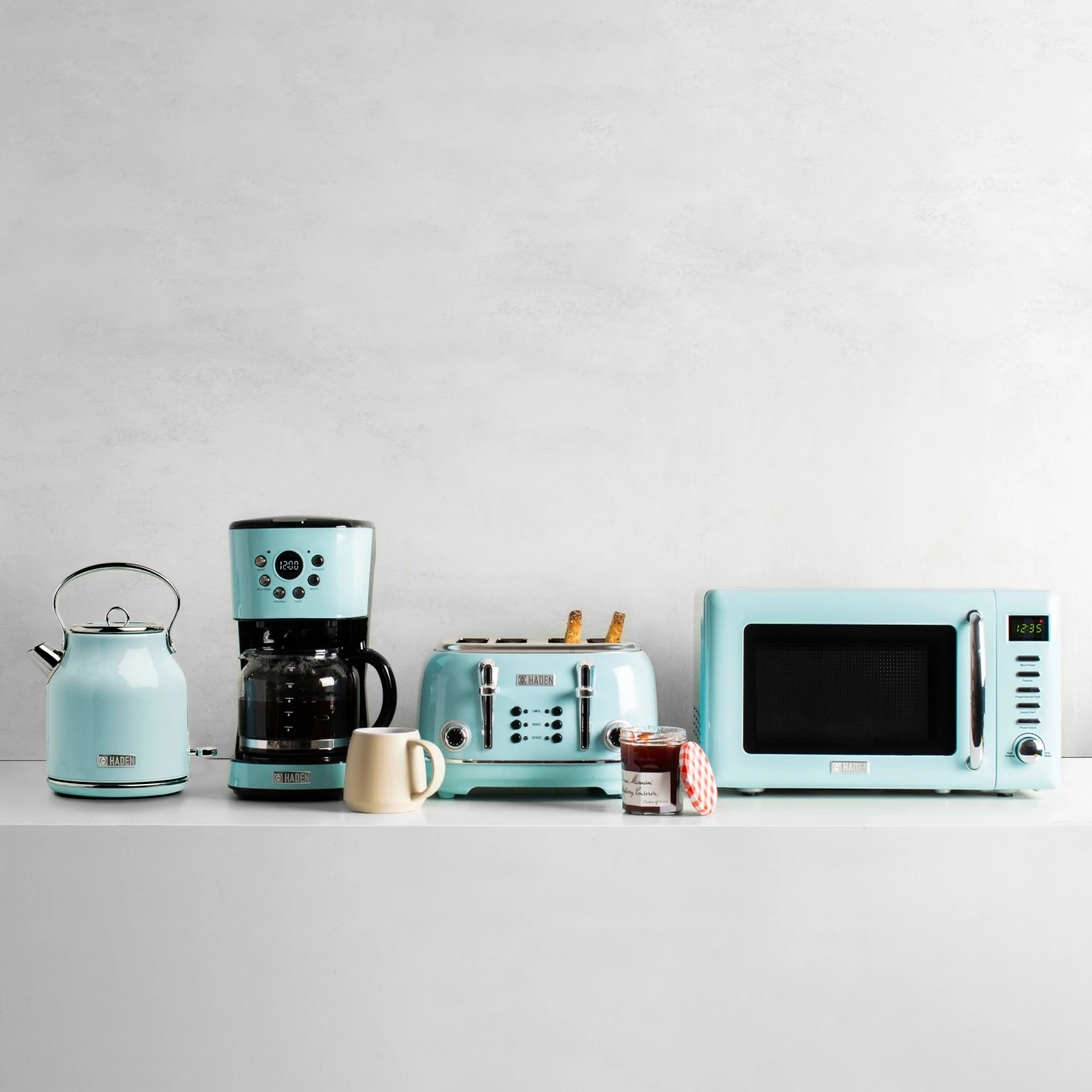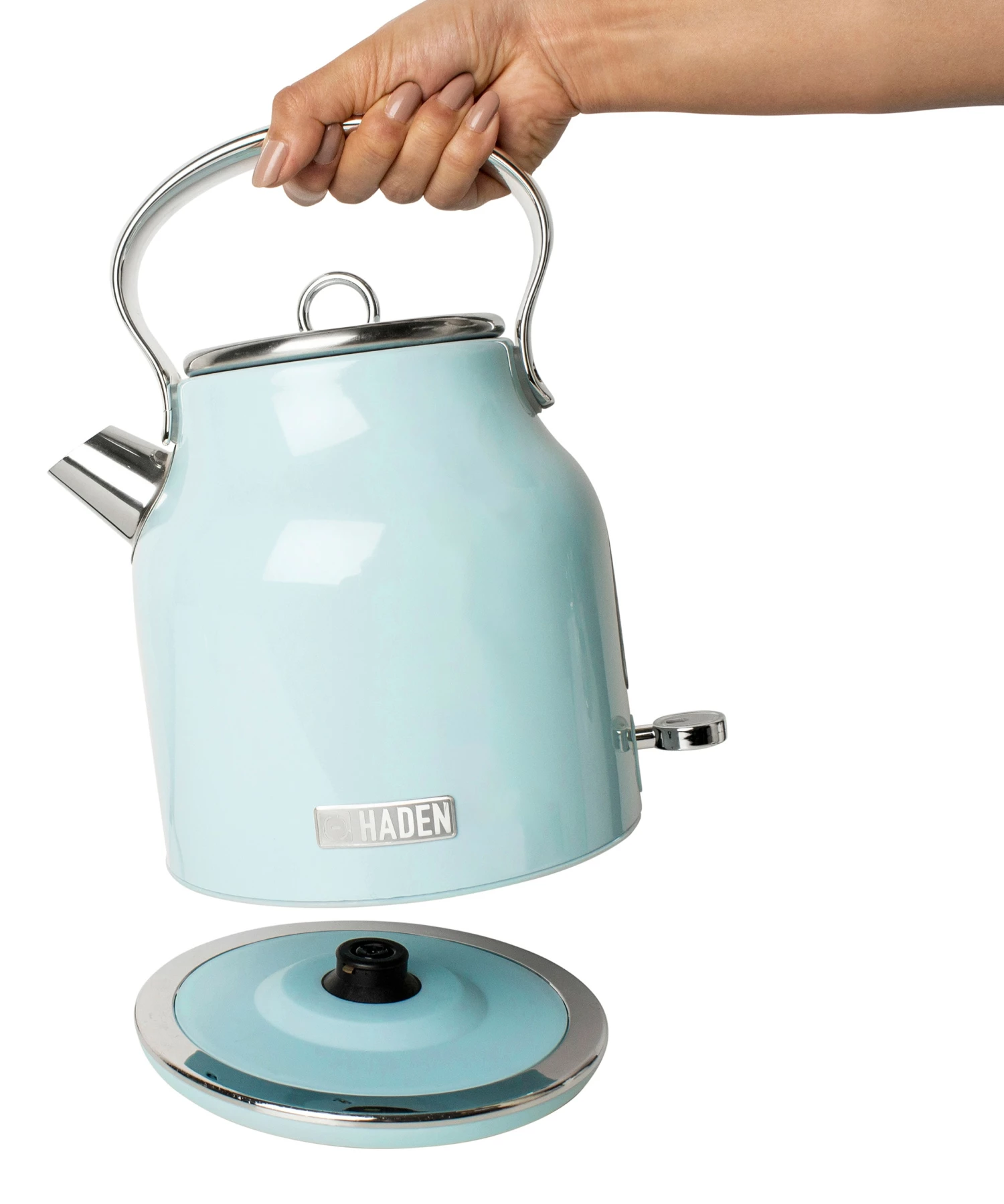 Now available in the United States the classic Heritage electric kettle by HADEN. With a traditional design and shape, this beautiful turquoise kettle features a 1.7-Liter (7 cup) capacity, ergonomic grip handle, water level gauge, light indicator during boiling and a spare filter. The cordless design makes it easy to move around your kitchen. The 360-Degree base stays cool and allows you to remove and place the kettle on it easily. The Boil-Dry protection safety feature ensures that the kettle will not turn on if no water is inside. Perfect for a great tasting cup of tea or for heating water for pour over coffee or instant coffee. Matching toaster, microwave, coffee maker, and blender also available. Electric kettle color options: Turquoise, Ivory White, Black/Copper, or English Rose