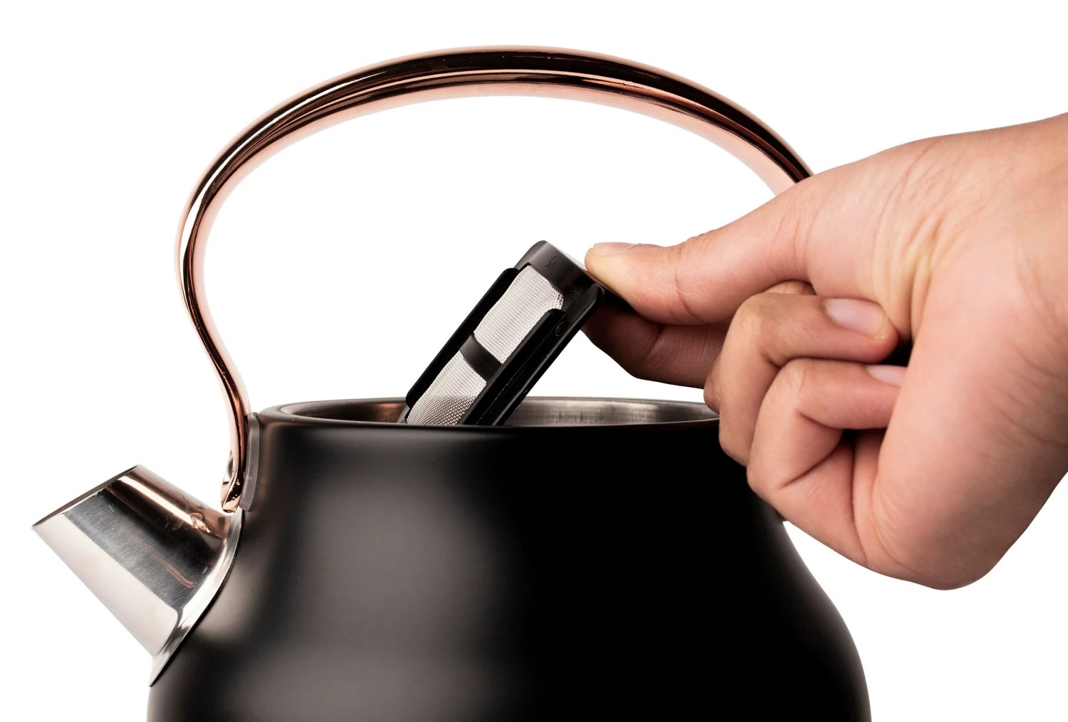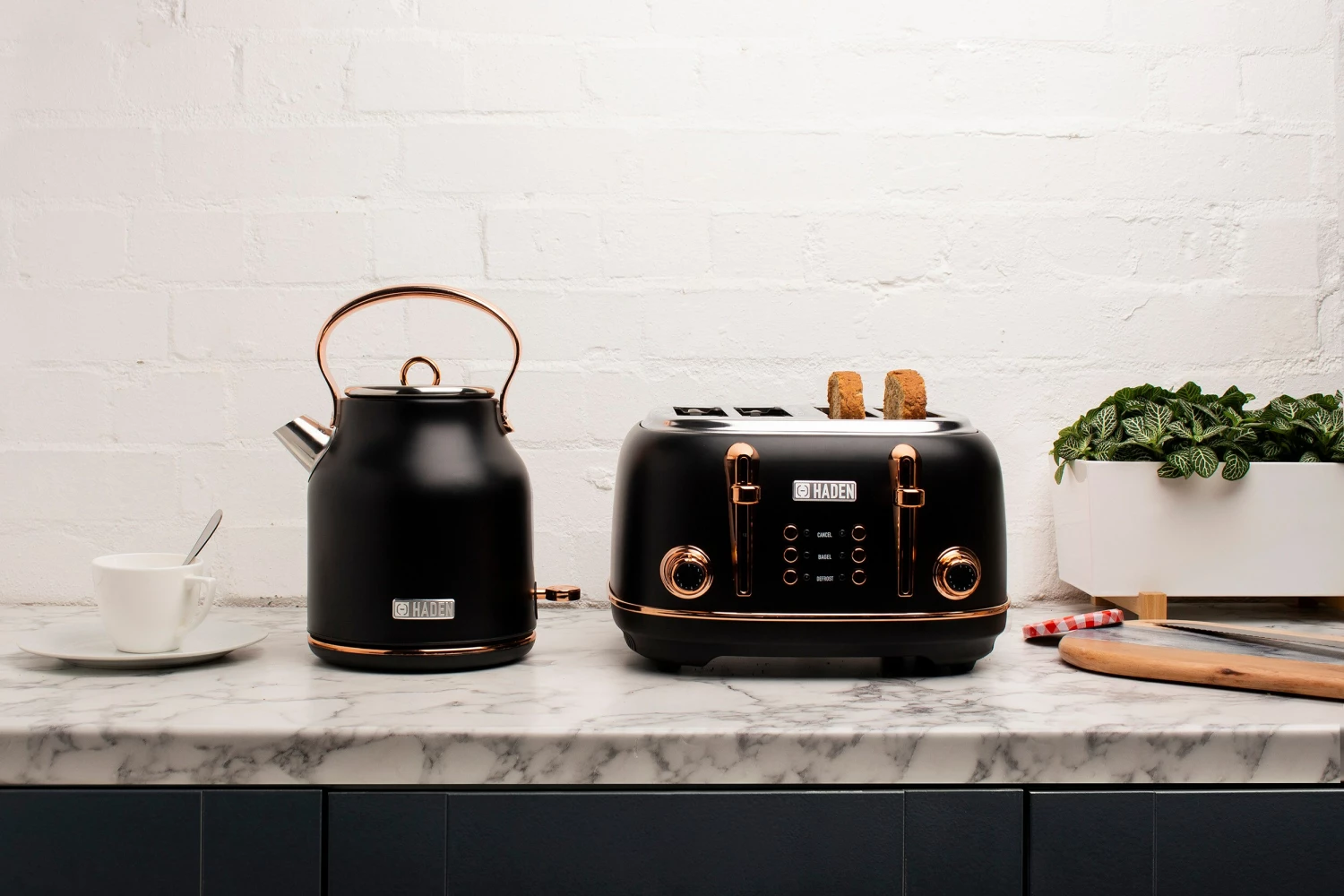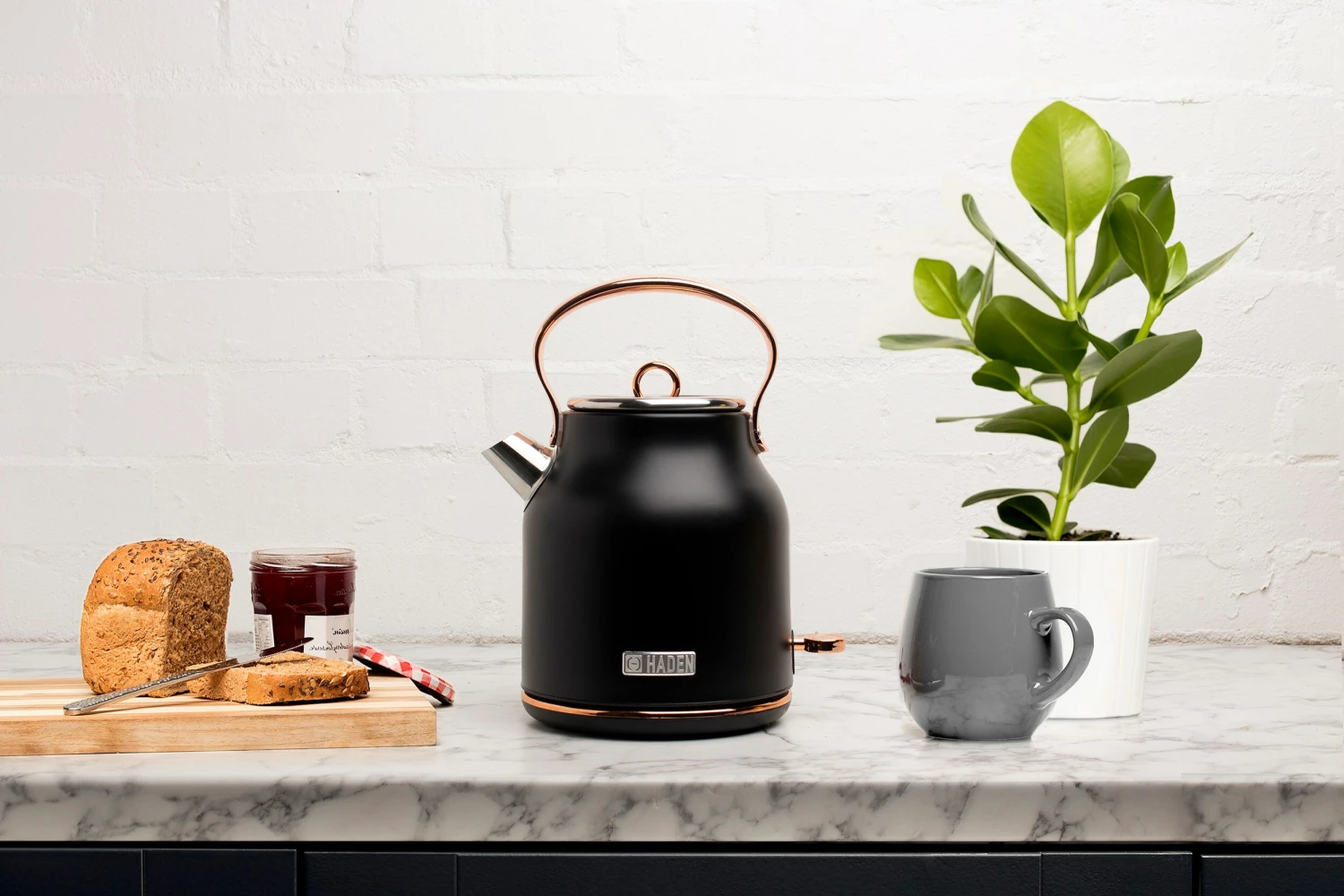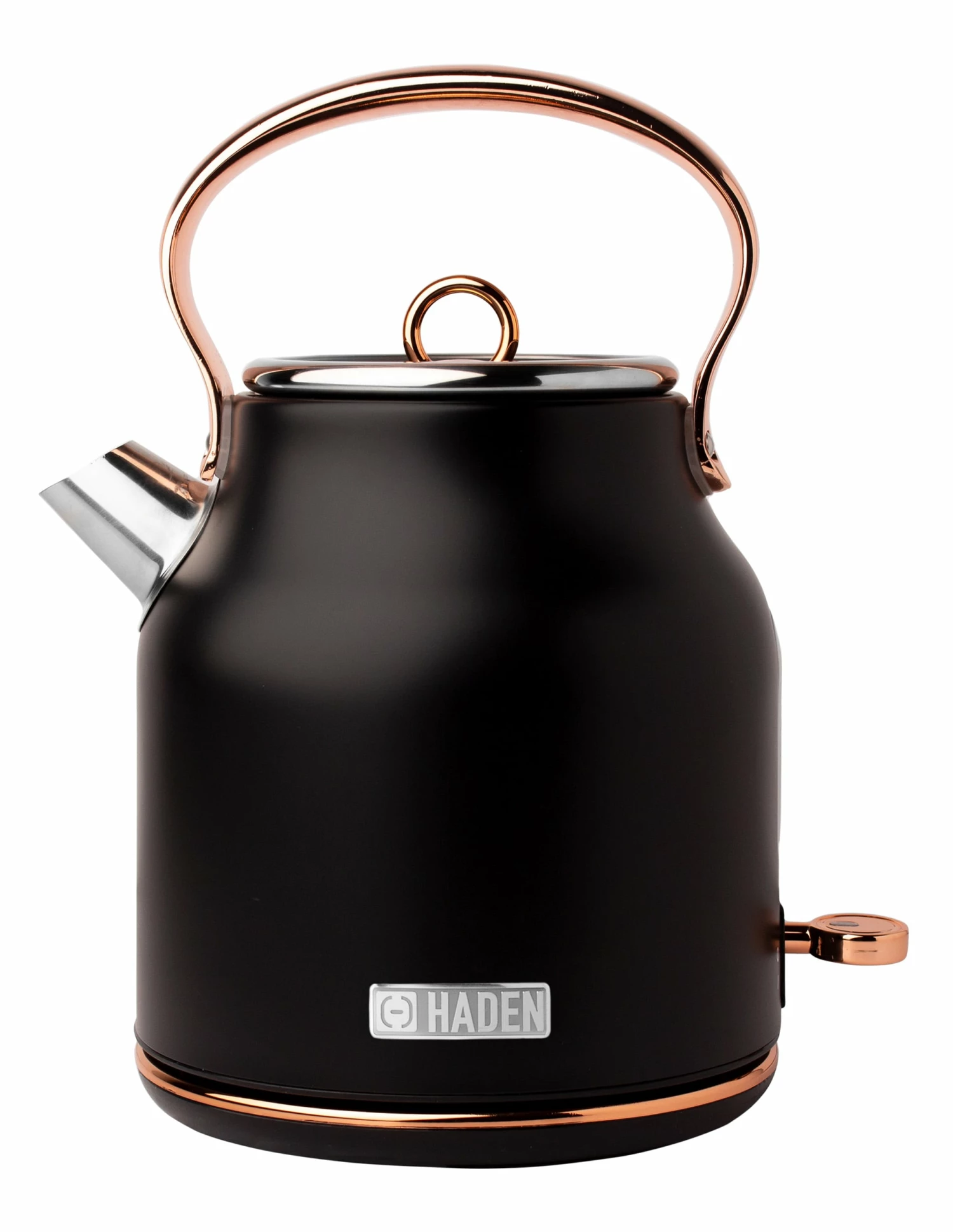 Now available in the United States the classic Heritage electric kettle by HADEN. With a traditional design and shape, this beautiful Black/Copper kettle features a 1.7-Liter (7 cup) capacity, ergonomic grip handle, water level gauge, light indicator during boiling and a spare filter. The cordless design makes it easy to move around your kitchen. The 360-Degree base stays cool and allows you to remove and place the kettle on it easily. The Boil-Dry protection safety feature ensures that the kettle will not turn on if no water is inside. Perfect for a great tasting cup of tea or for heating water for pour over coffee or instant coffee. Matching toaster also available. Electric kettle color options: Turquoise, Ivory White, Black/Copper, or English Rose