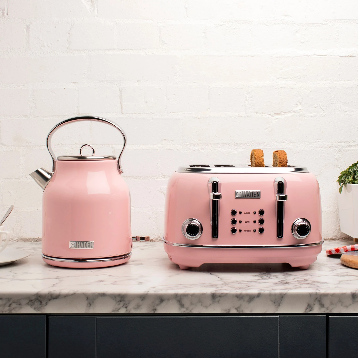Now available in the United States the classic Heritage electric kettle by HADEN. With a traditional design and shape, this beautiful English Rose kettle features a 1.7-Liter (7 cup) capacity, ergonomic grip handle, water level gauge, light indicator during boiling and a spare filter. The cordless design makes it easy to move around your kitchen. The 360-Degree base stays cool and allows you to remove and place the kettle on it easily. The Boil-Dry protection safety feature ensures that the kettle will not turn on if no water is inside. Perfect for a great tasting cup of tea or for heating water for pour over coffee or instant coffee. Matching toaster also available. Electric kettle color options: Turquoise, Ivory White, Black/Copper, or English Rose