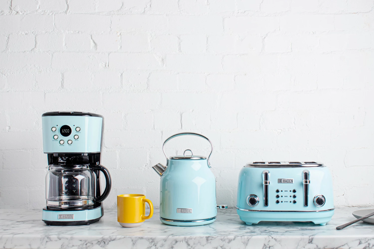 Produce the perfect cup of coffee with ease and style with the Haden filter coffee maker. The vibrant turquoise color will add a pop of color to any kitchen. This coffee maker has six functions including: on/off, delay brew, program, hour, minute, and strength. It also has an LCD display and a thirty-second anti-drip feature. The 1.5 liter/12 cup glass carafe and funnel are also dishwasher safe for added convenience. This coffee maker also has a keep warm feature so if one cup is not enough, you can simply pop back and pour yourself another cup! Perfectly matches our Heritage kettle, toaster, microwave, coffee maker, and blender Turquoise collection.