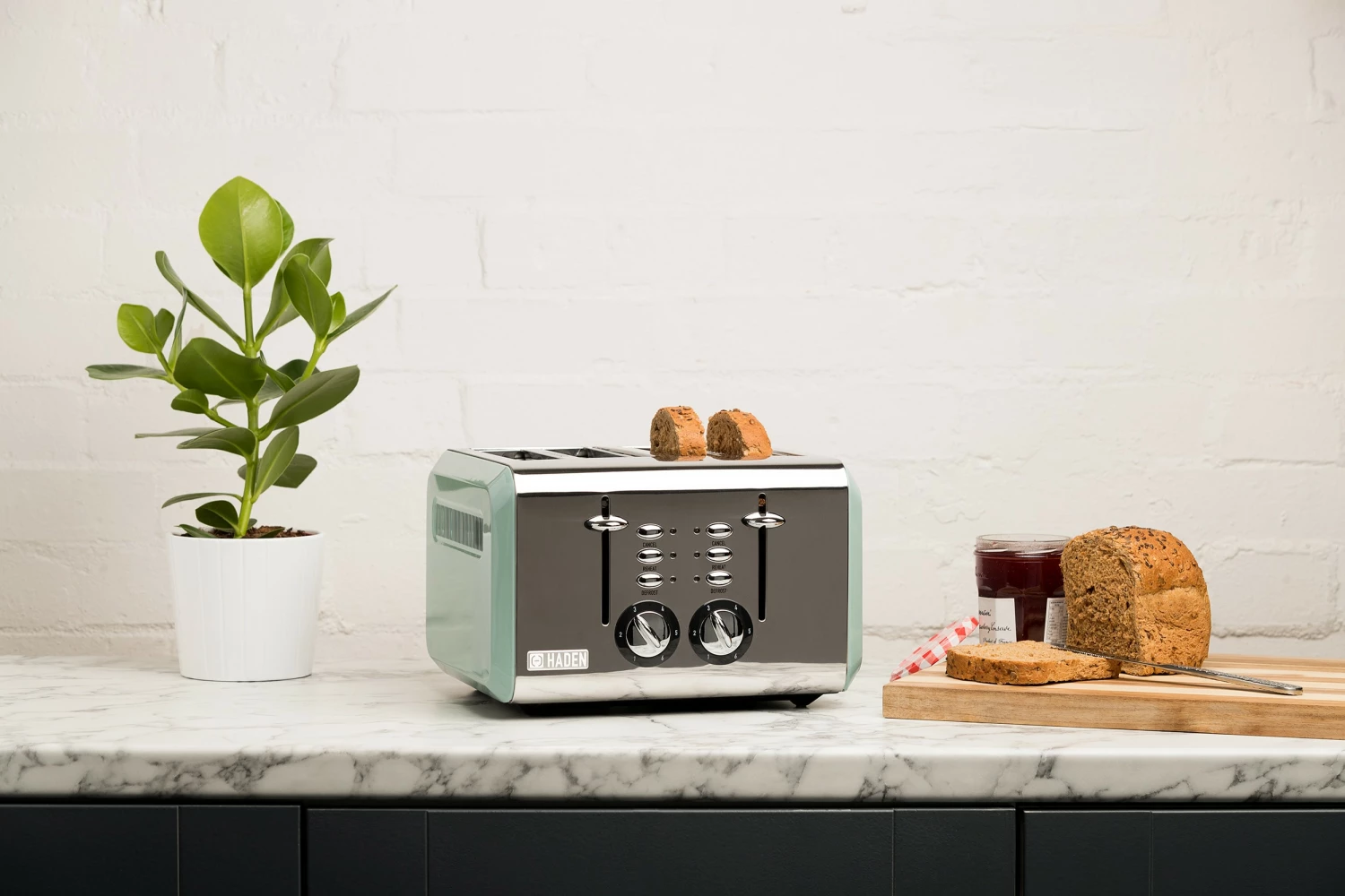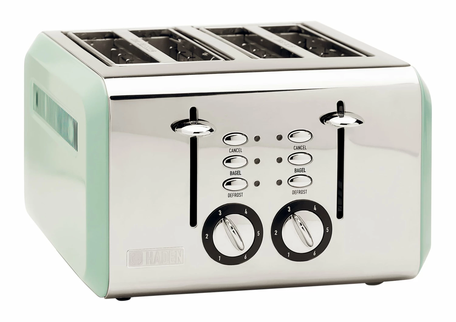 - Features Four Slice Toaster with Extra Wide Slots for Bagels, Painted Stainless Steel Housing with Haden Badge, Self-Centering Function, and Removable Crumb Tray