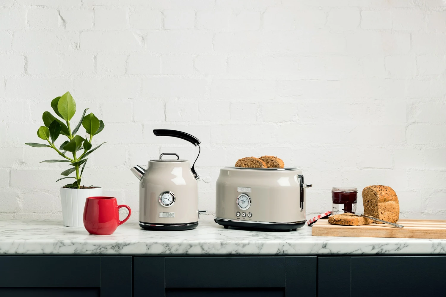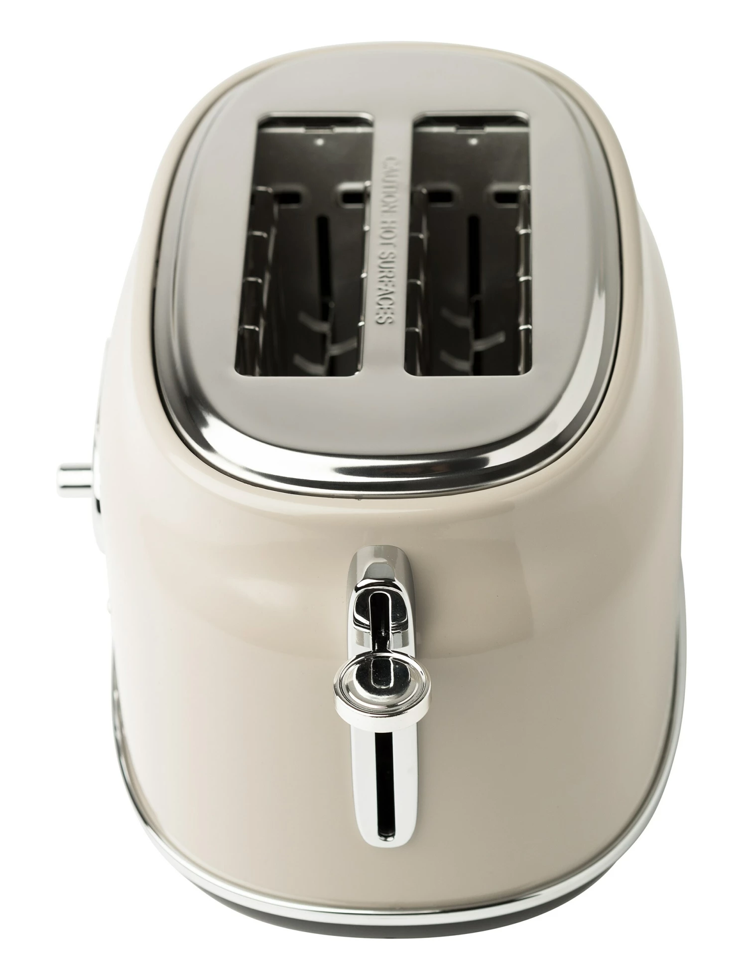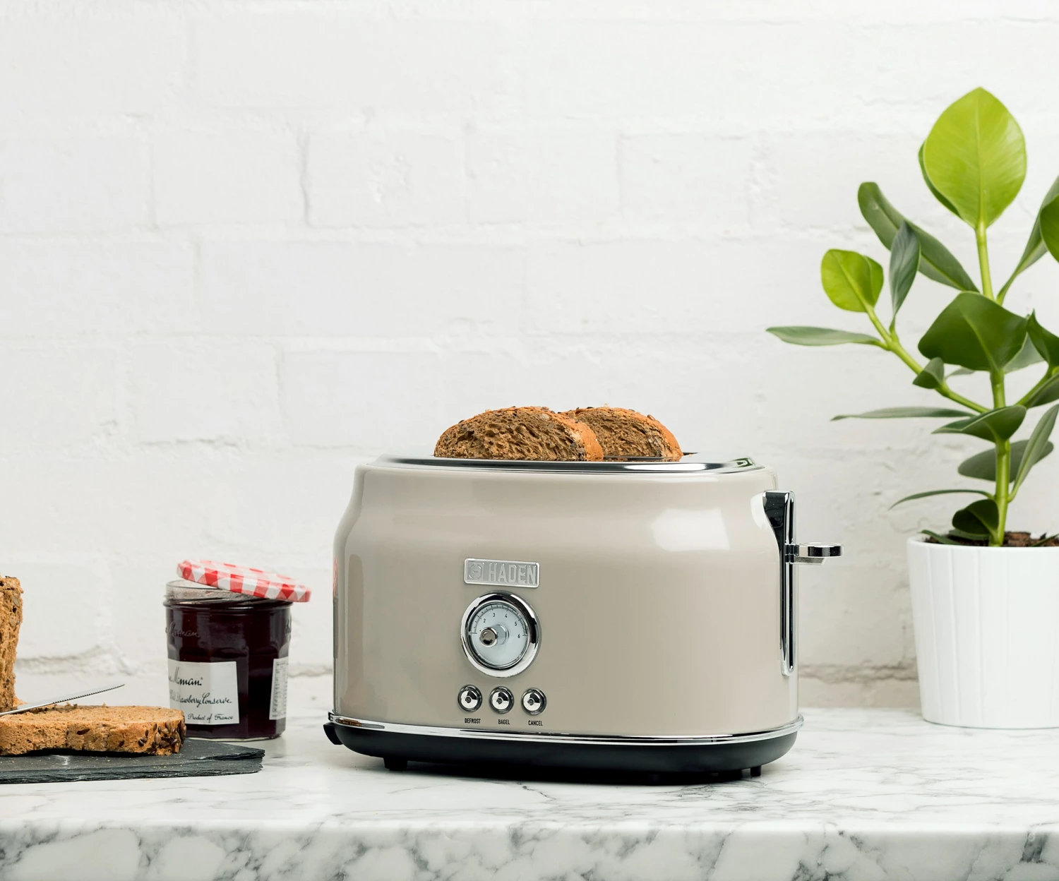 Introducing the Dorset toaster by HADEN. Available in two colors, (Red and Putty) this 2-Slice toaster has a stylish shape and design. Brighten up your morning routine with this beautiful toaster. Haden toasters feature: cancel/defrost/bagel button settings, self centering function and a removable crumb tray for easy cleaning. The browning control dial allows you to select the perfect timing for your bread, English muffin or waffle. Its beautiful hue is sure to brighten up your day. Matching kettle also available.