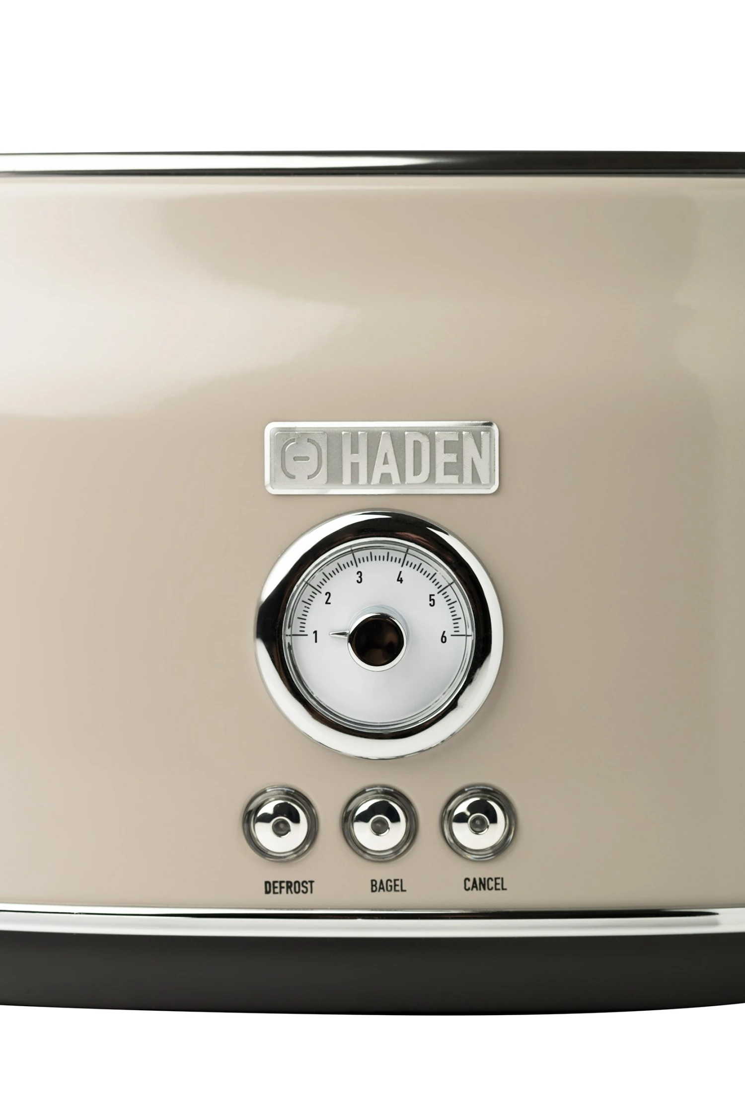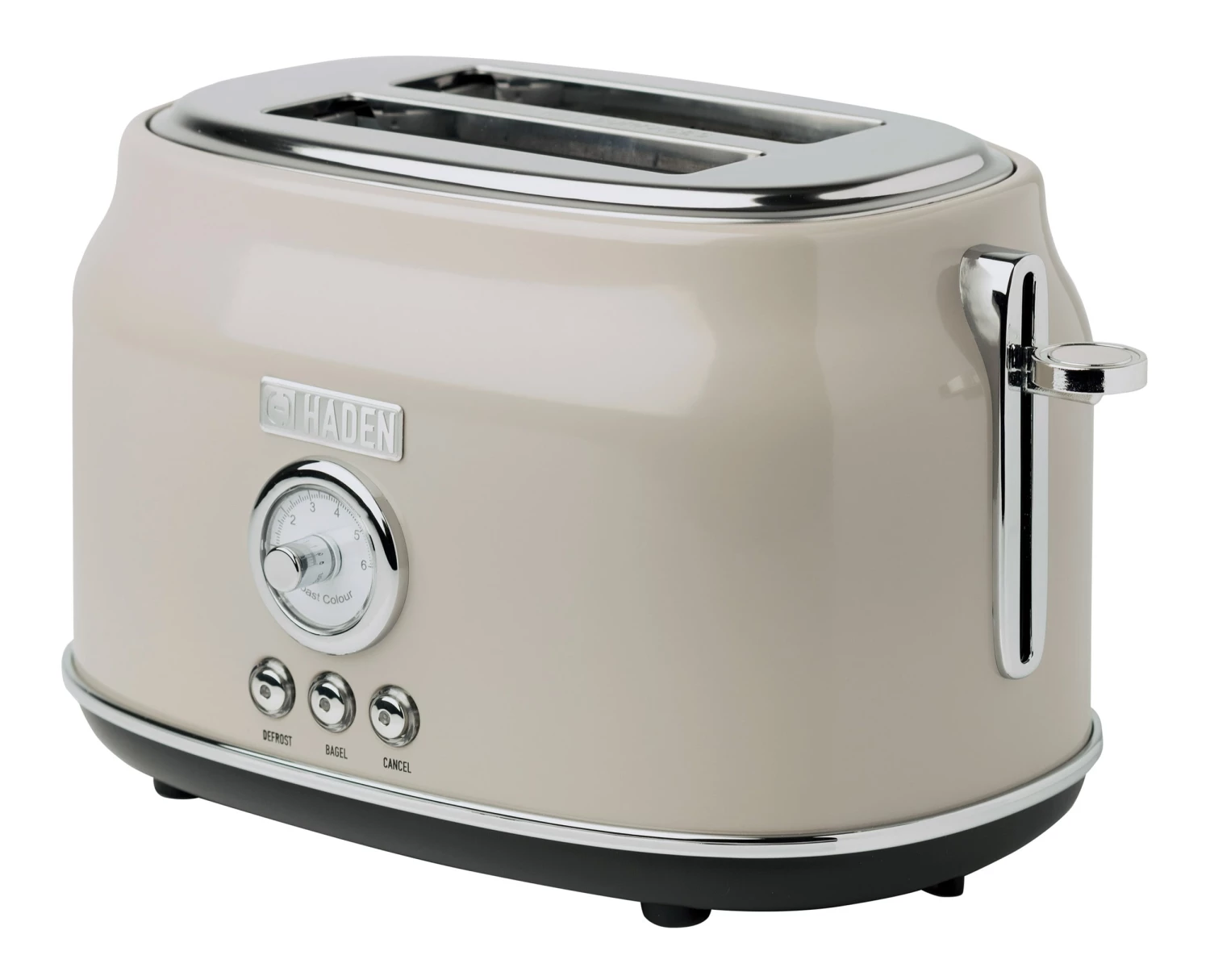 - Features: Two Slice Toaster with Extra Wide Slots for Bagels Painted Stainless Steel with Haden Badge, Painted Stainless Steel Housing with Haden Badge, Self-Centering Function, and Removable Crumb Tray