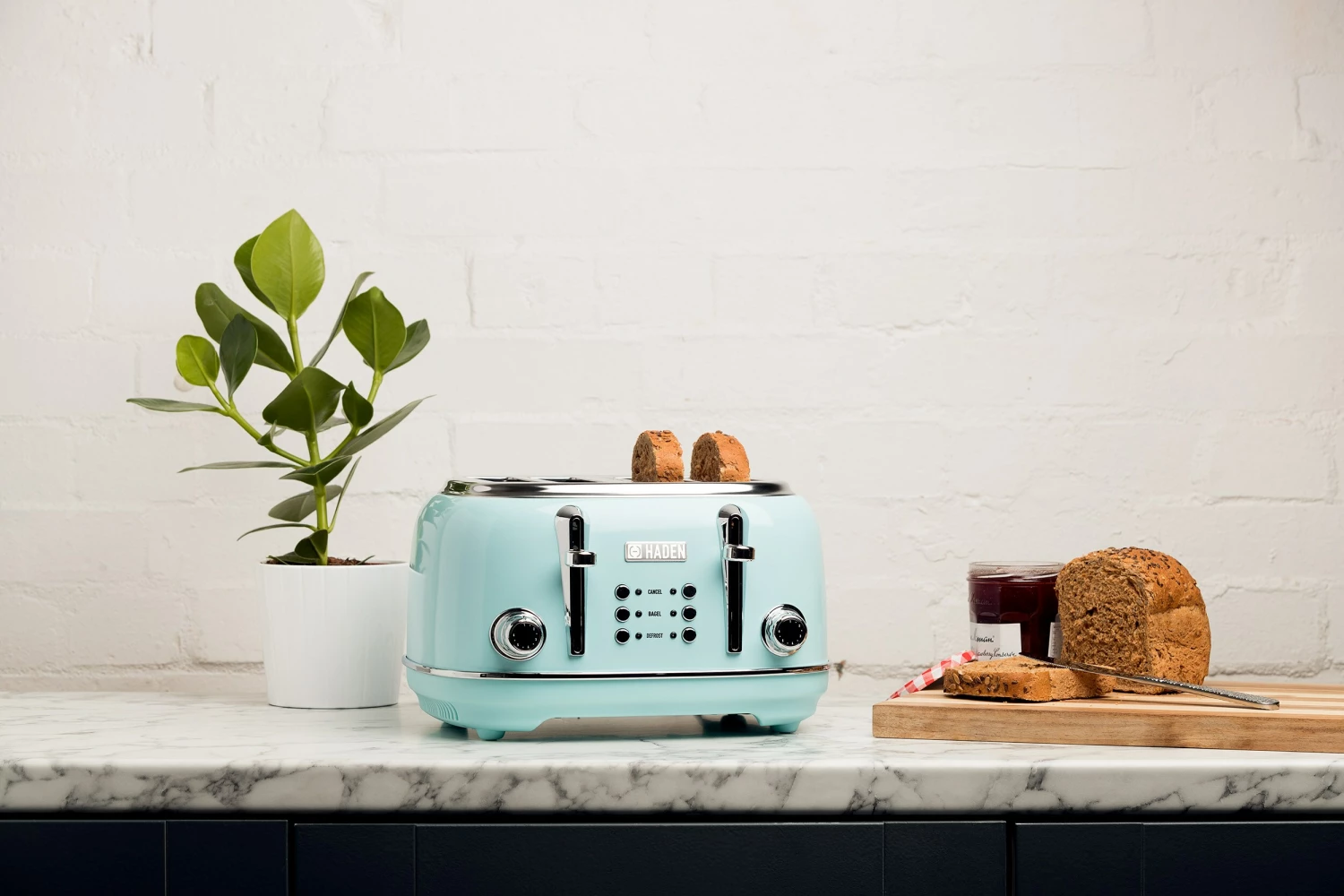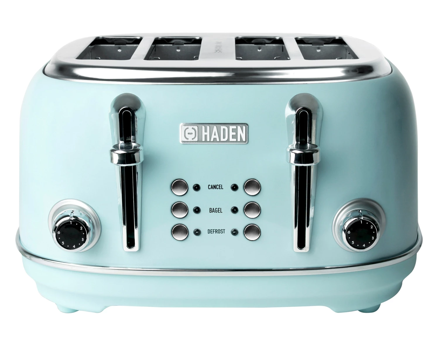 - Features: Four Slice Toaster with Extra Wide Slots for Bagels, Painted Stainless Steel Housing with Haden Badge, Self-Centering Function, and Removable Crumb Tray