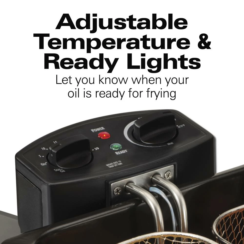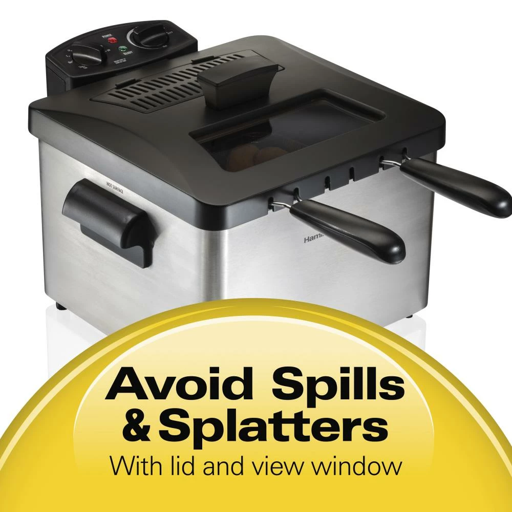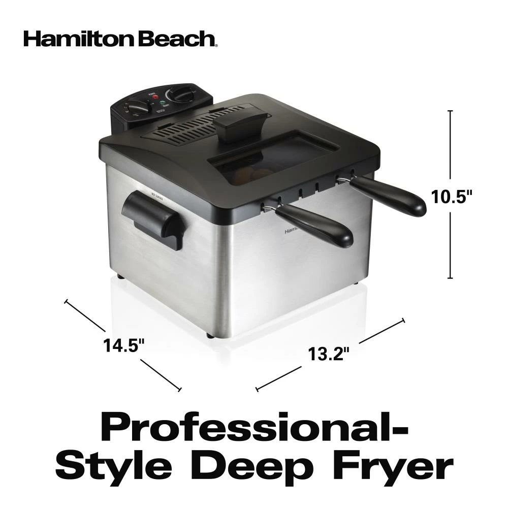 Hamilton Beach Professional-style deep fryer helps you fry like a pro. The 12-cup food capacity lets you easily feed a crowd fried favorites by cooking more per batch. Double baskets let you fry different foods at once or use the large basket to quickly make a big batch of a single food. Immersed heating device heats oil faster to the ideal temperature so you save time getting the perfect fry. Avoid splatters with the lid while still monitoring cooking through the view window. Breakaway cord prevents the fryer from tipping over if the cord is snagged.