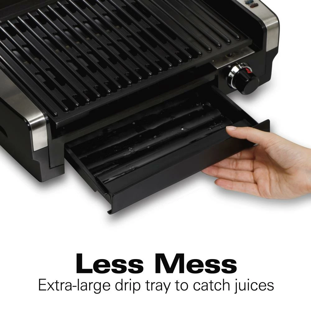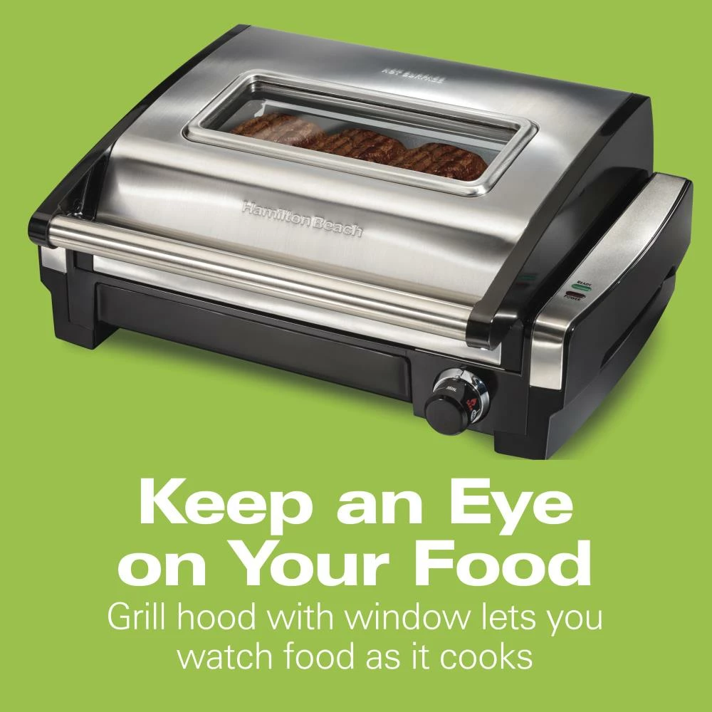 Enjoy outdoor grilled flavor anytime you like, no matter the weather. The searing grille’s high-heat temperature locks in juices and flavor, giving your meat better taste, texture, and appearance. Unique hooded design with window helps keep in flavor to give your food that authentic outdoor grilled taste and lets you keep an eye on your food without opening up lid and releasing heat. There’s no messing with propane, charcoal, or lighter fluid, so cooking could’t be easier. Simply plug it in and turn the temperature dial all the way up to sear. When it reaches the high-heat searing temperature of 450 degrees, the green preheat light will glow. Now you’re ready to sear steaks, burgers, pork chops, or fish fillets to perfection. If you want to grill food that does’t need to sear first, the searing grill has an adjustable temperature dial for lower heat.