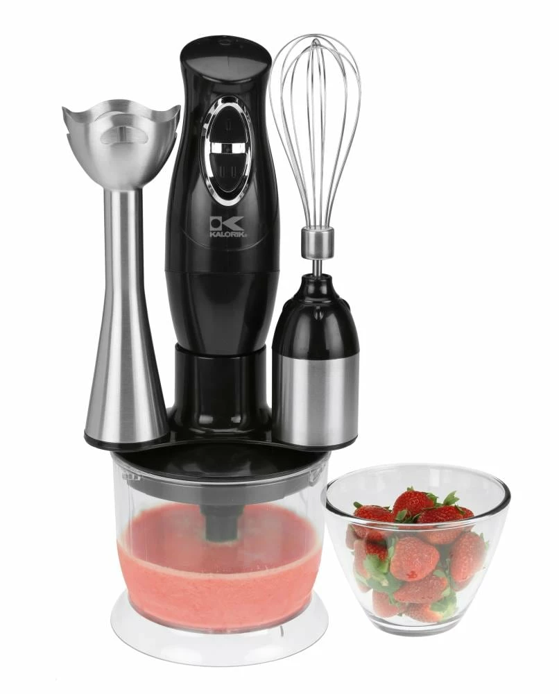 The 3-in-1 Combo mixer by Kalorik is the perfect marriage between function and design. Keep everything needed for quick food prep neatly organized and within reach thanks to this three -in-one combination stick mixer. The unit provides a handle with a decorative chrome panel for a secure grip and a long stainless steel shaft that reaches effortlessly into pots, pans, or mixing cups for blending purees, sauces, protein shakes, or smoothies. Best of all, the appliance converts from a stick mixer to a whisk with a simple twist for making homemade whipped cream or cakes. It can also be attached to the included chopper for chopping up green peppers, onions, garlic, and more in seconds. The full mixing set with its entourage of accessories stores elegantly with the help of its convenient holder.