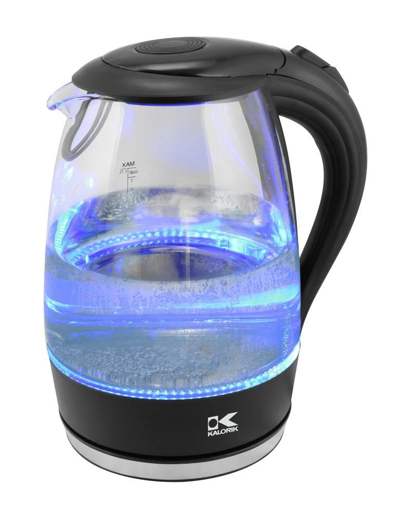 The Kalorik glass water kettle with blue LED lights makes boiling easier than ever! in a matter of minutes (Faster than the stove top and the microwave), enjoy your favorite tea, hot chocolate, instant coffee, soup and more. With the auto shut-off function, the kettle will never get dry. The LED blue illumination makes this jug kettle the perfect complement to any kitchen decor.