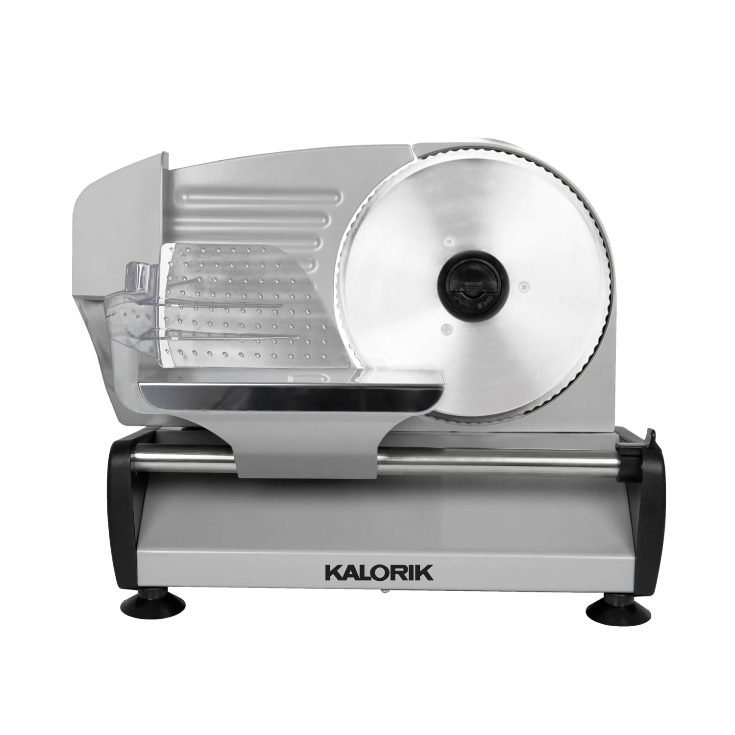 The Kalorik 200 Watts Professional Food Slicer delivers professional-quality, delicatessen cuts every time. A 7.5″ serrated stainless steel blade and powerful 200-watt motor effortlessly slice cheese, meat, bread, vegetables and more. Thickness control lets you adjust slices from deli-thin to thick for uniform cutting. The blade is easily removed for convenient cleanup and storage. The “safe mode” feature ensures secure handling when not in use.