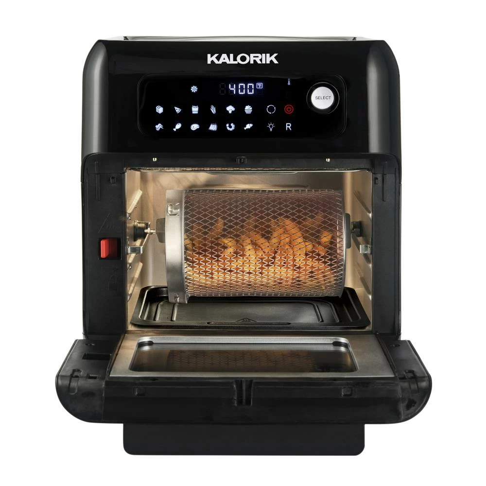 Meet your most versatile kitchen appliance yet. The Kalorik 10 Quart air fryer oven can bake, fry, grill, toast and roast your favorite foods up to 30% faster – with no preheating required. The Kalorik 10 Quart air fryer oven uses rapid hot air technology to cook food to golden, fried perfection – all without the need for oil. This reduces fat by up to 75%. The oven comes with a rotating rotisserie spit for delicious golden chicken, rotating skewers, two air racks, and a rotating mesh basket for deliciously crispy fries. With 13 smart presets and a digital display, the Kalorik air fryer is intuitive and easy to use.