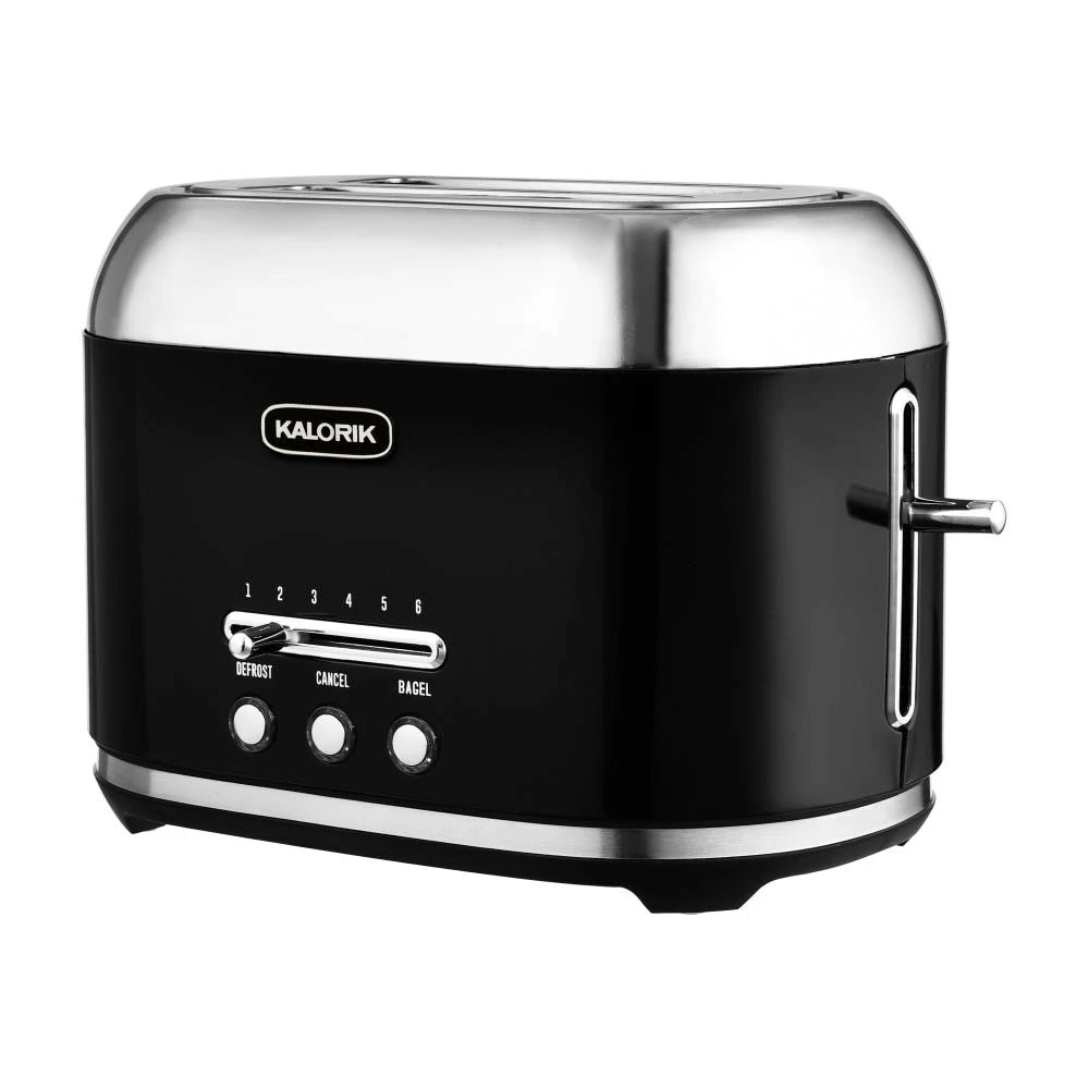 Retro design meets modern functionality in this 1950’s-inspired toaster, guaranteed to add a classic touch of elegance to any kitchen. The Kalorik 2-slice retro toaster features an adjustable browning slider with six shade settings to suit your preference. Extra wide toasting slots can fit bagels and thicker slices of bread. Easy one-touch functions include bagel, defrost and cancel. A removable crumb tray makes cleanup quick and easy, and keeps your countertop crumb-free. The compact design features cord storage in the base, so the toaster can fit neatly on your countertop. Part of the Kalorik retro line, the Kalorik 2-slice retro toaster comes in vintage cream and retro black. Get the matching coffee maker and kettle to complete the look!