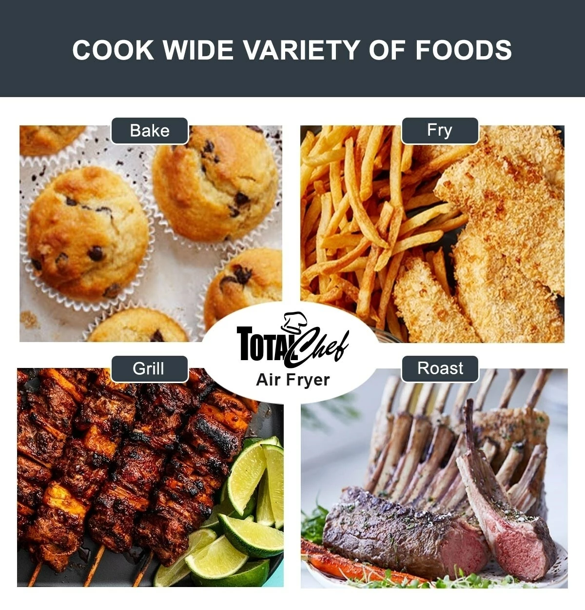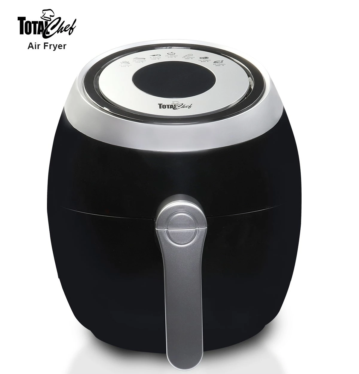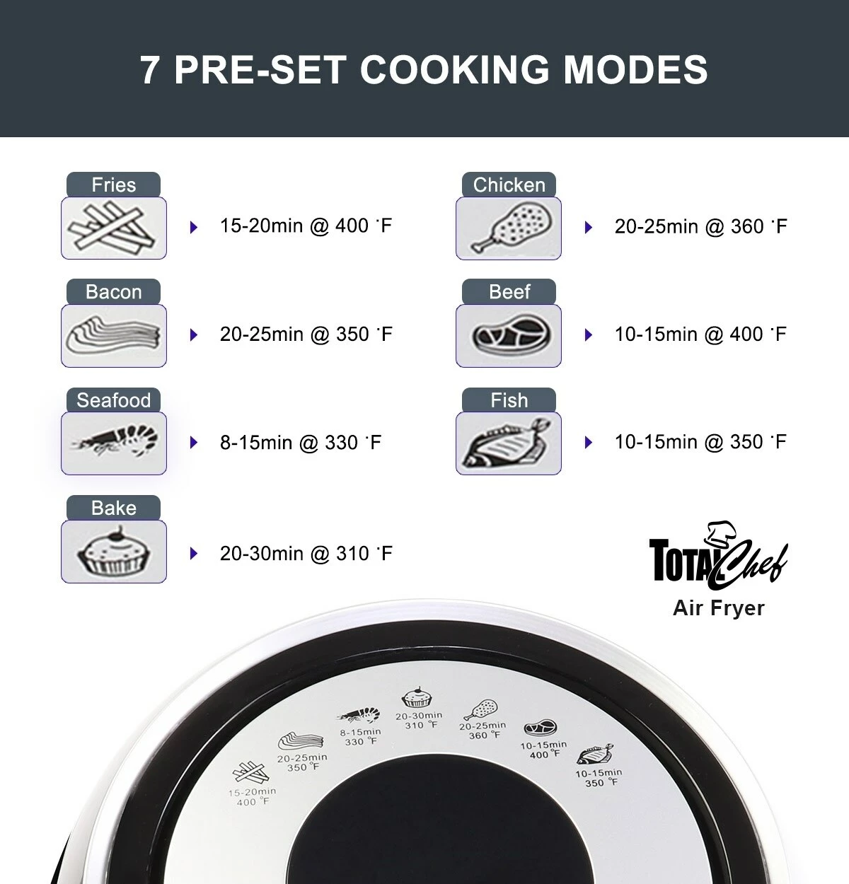 Convenient, low-calorie cooking the Total Chef 7-in-1 electric air fryer is the perfect cooking tool for everyone from busy families to college students. The large capacity basket and multiple pre-set and customizable cooking options make preparing your favourite foods simple and healthy. Rapid hot air circulation technology cooks from all directions, leaving your food crispy on the outside and juice inside while using little or no oil. Compact, user-friendly design the air-fryer’s sleek black and silver look and compact profile make it the perfect all-in-one cooker so you fry, bake, grill, and roast in small kitchens, college dorms, or on the go in your RV. Choose from 7 pre-set cooking modes, including fries, bacon, seafood, bake, chicken, beef, and pork or fish, or set temperature and timer using the intuitive touchscreen control with bright clear LED display safe and effortless cooking and cleanup the Total Chef 7-in-1 electric air fryer’s safety features include an audible signal and automatic standby feature upon completion of the cooking cycle, as well as a cool-touch handle and convenient basket release button. Clean-up is a breeze with the dishwasher-safe non-stick pan and stainless steel basket. You will want to try it for everything from frozen veggies, dumpling, pizza, chicken, or even reheating yesterday’s dessert!