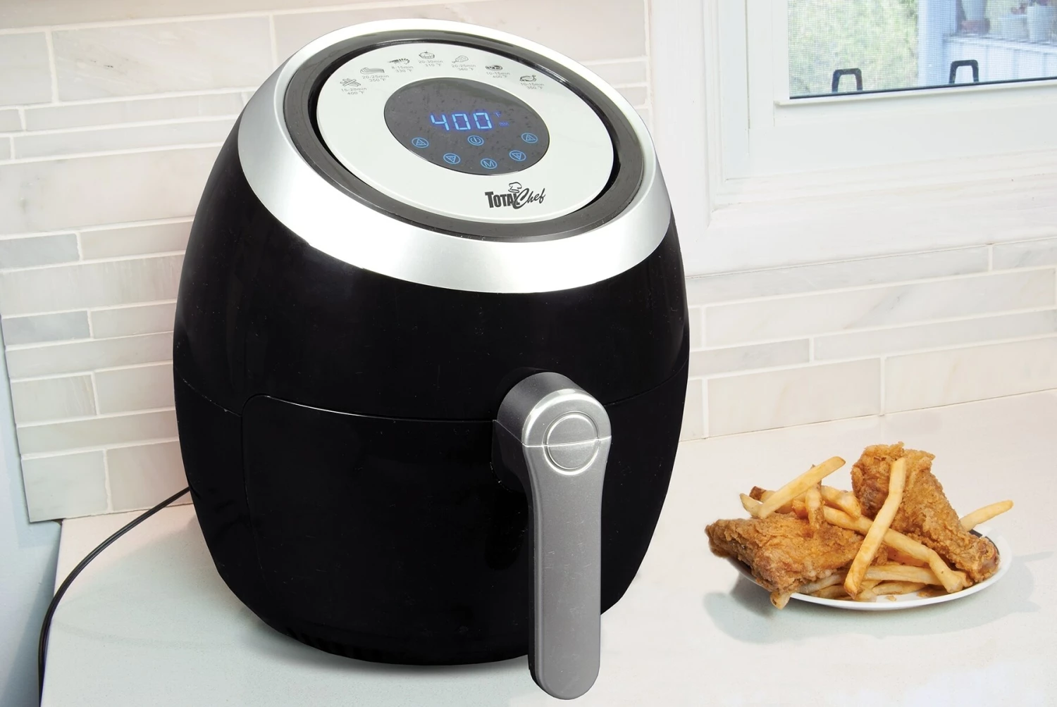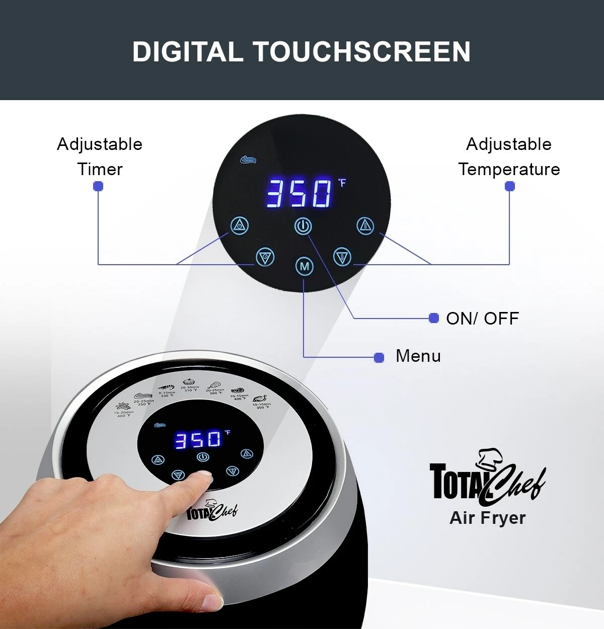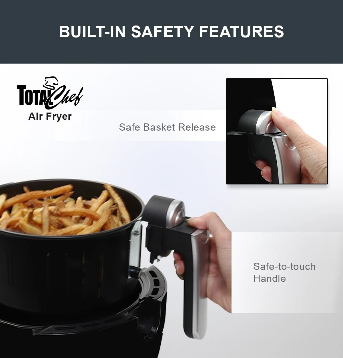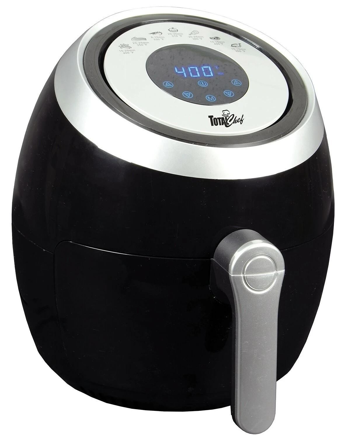 Convenient, low-calorie cooking the Total Chef 7-in-1 electric air fryer is the perfect cooking tool for everyone from busy families to college students. The large capacity basket and multiple pre-set and customizable cooking options make preparing your favourite foods simple and healthy. Rapid hot air circulation technology cooks from all directions, leaving your food crispy on the outside and juice inside while using little or no oil. Compact, user-friendly design the air-fryer’s sleek black and silver look and compact profile make it the perfect all-in-one cooker so you fry, bake, grill, and roast in small kitchens, college dorms, or on the go in your RV. Choose from 7 pre-set cooking modes, including fries, bacon, seafood, bake, chicken, beef, and pork or fish, or set temperature and timer using the intuitive touchscreen control with bright clear LED display safe and effortless cooking and cleanup the Total Chef 7-in-1 electric air fryer’s safety features include an audible signal and automatic standby feature upon completion of the cooking cycle, as well as a cool-touch handle and convenient basket release button. Clean-up is a breeze with the dishwasher-safe non-stick pan and stainless steel basket. You will want to try it for everything from frozen veggies, dumpling, pizza, chicken, or even reheating yesterday’s dessert!