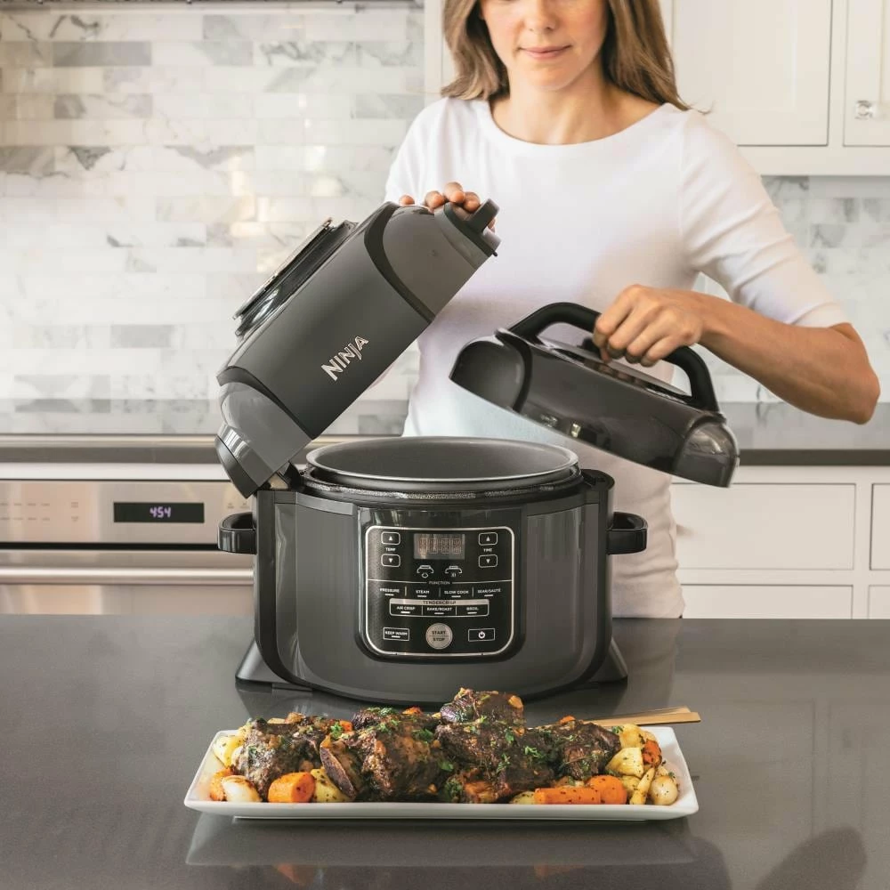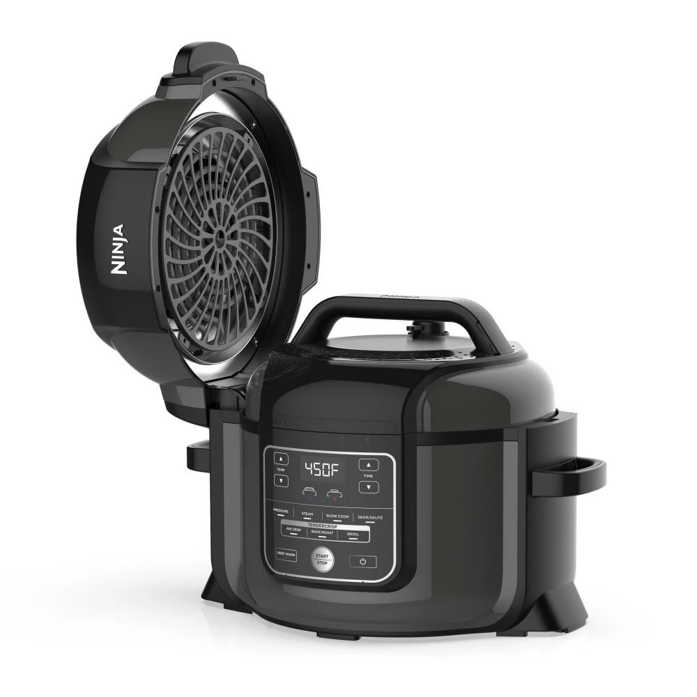 The Ninja Foodi, The Pressure Cooker That Crisps. With Tender Crisp Technology, you can achieve all the quick cooking and tenderizing wonders that you love about pressure cookers. But where they stop, the Foodi is just getting started. Its revolutionary Crisping Lid allows you to air fry, bake, roast, and broil. That means you can pressure cook to lock in juices, then finish with a crisp. Only the Ninja Foodi gives you the best of pressure cooking and air frying, all in one pot. Transform frozen foods to crispy meals. Create wholesome, multi-textured 360 meals by cooking proteins, veggies, and grains all together. Elevate your favorite stew and chili recipes by adding a crispy or bubbly top to make one-pot wonders.