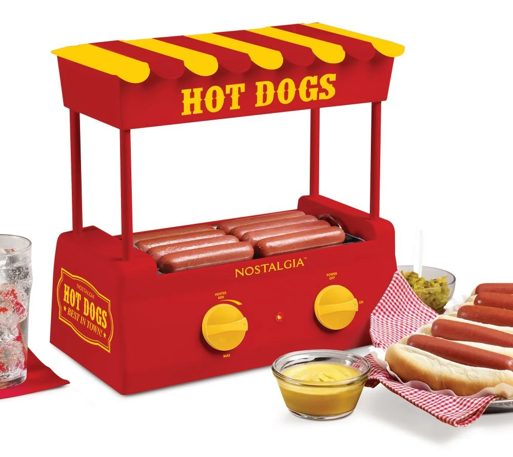 - GREAT STYLE and GREAT TASTE: Retro-looking hot dog roller cooks up to 8 regular-size or 4 foot-long hot dogs at a time, as well as breakfast sausages, bratwursts, taquitos, and egg rolls