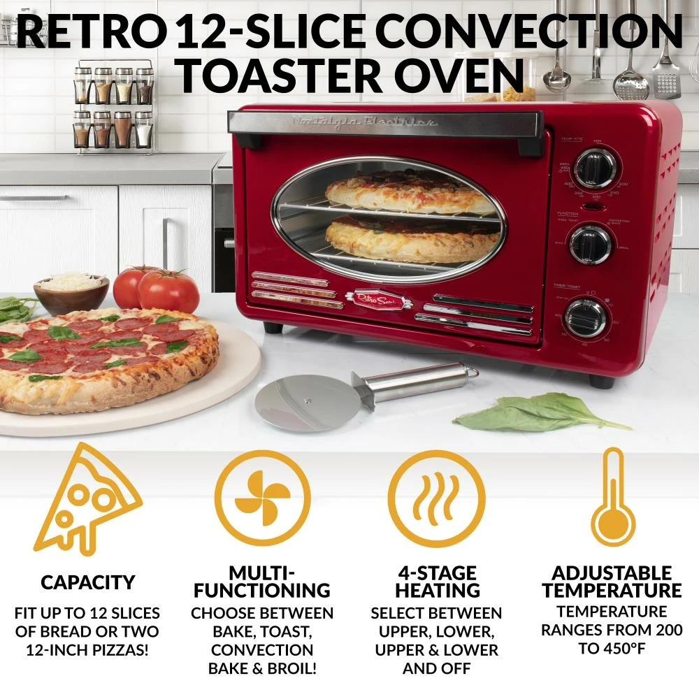Cooking has never been easier with this stylish 1500-watt countertop oven. This unit is capable of baking, convection baking, toasting and broiling a wide variety of tasty meals, snacks and desserts. With an adjustable cooking temperature of 200Рto 450Ь this two shelf unit has the versatility to bake two 12-inch pizzas, carefully toast twelve slices of bread, or neatly broil tenderloin steaks. Easily keep track of cooking times by using the built-in 60-minute timer that elicits an audible ding when done. Two nickel-plated racks, an aluminum baking pan, and crumb tray are included.