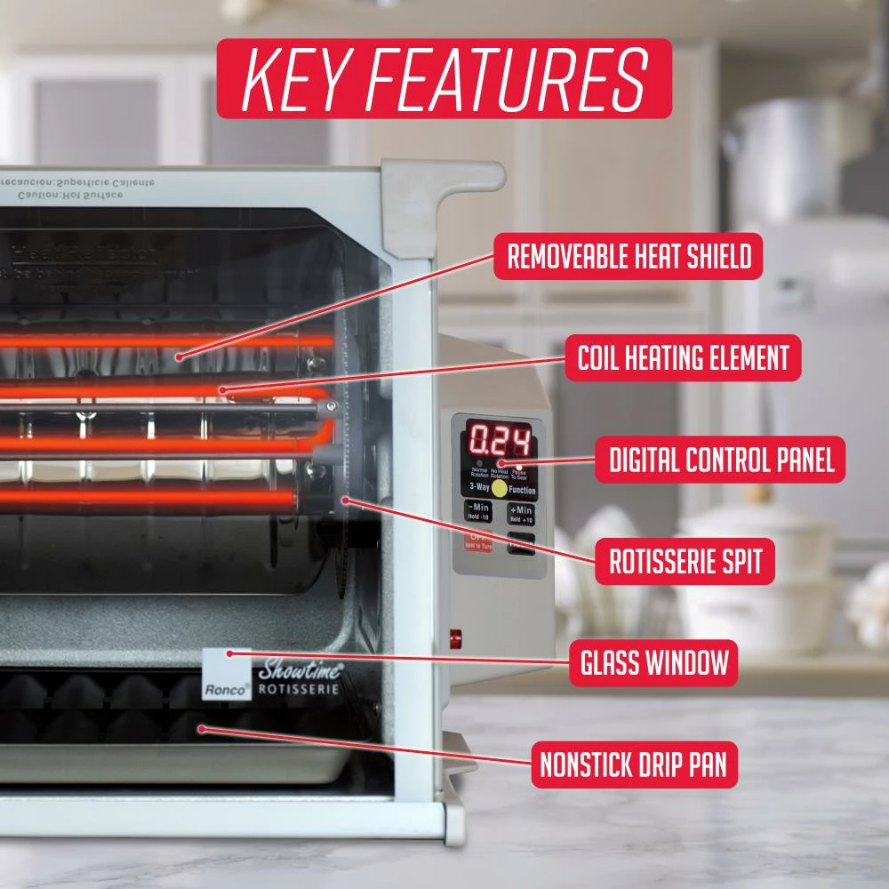 - AUTO SHUTOFF: An adjustable, 3 hour timer makes the Ronco Showtime Platinum Rotisserie Oven as easy as ever to use and will automatically shut off when time is up so you don’t have to worry about overcooked foods